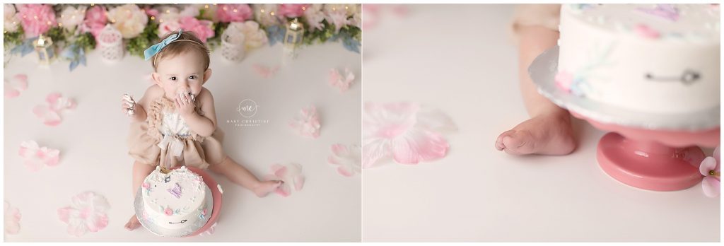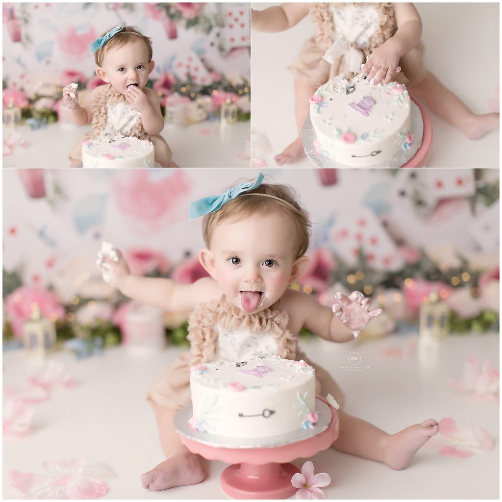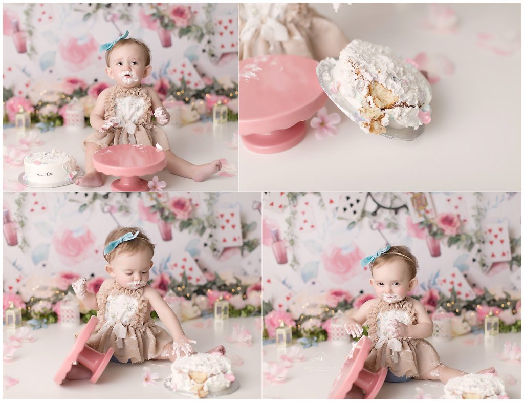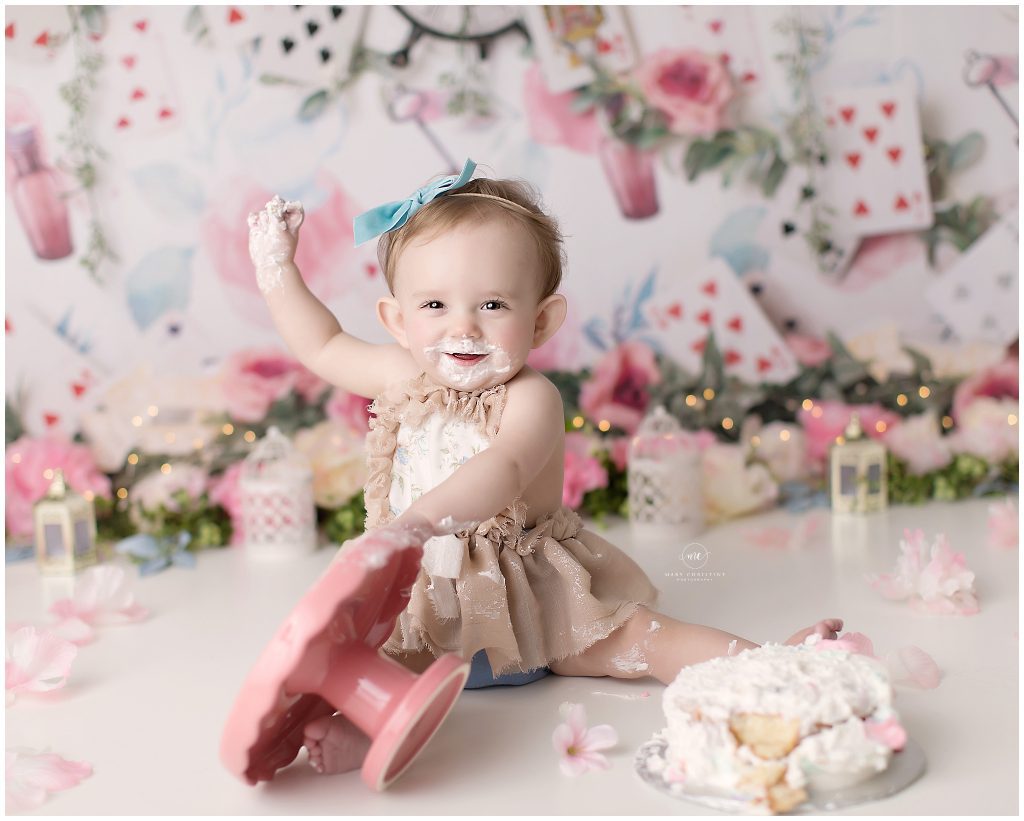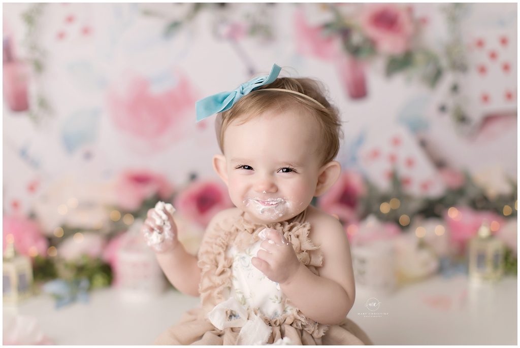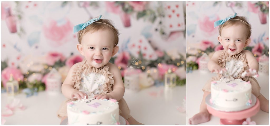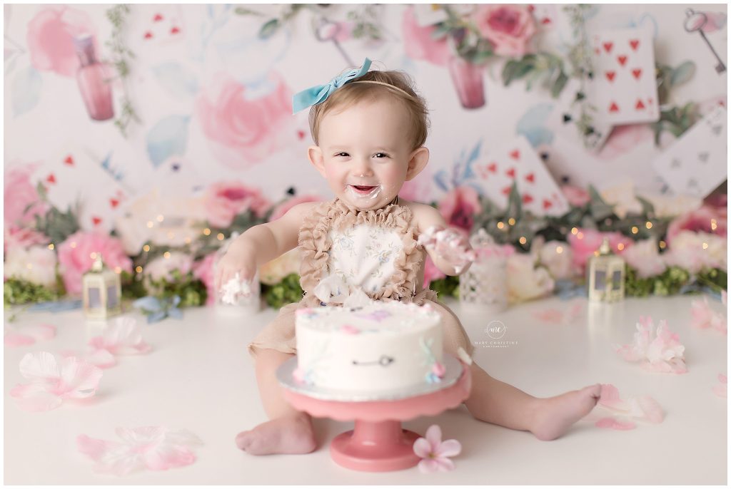 Welcome this sweet girl’s Alice in Wonderland cake smash to the Brunswick Ohio photographer blog! Oh this sweet baby girl! I have been photographing her since she was in her momma’s belly. Let me tell you, this rainbow baby is full of JOY. Her personality is so cheerful- it has been an absolute privilege to photograph her!