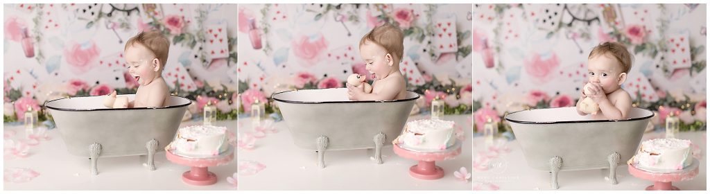 Nothing better than a quick clean up in a tub after your Alice in Wonderland cake smash. Baby girl loved the water too!