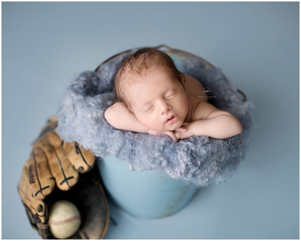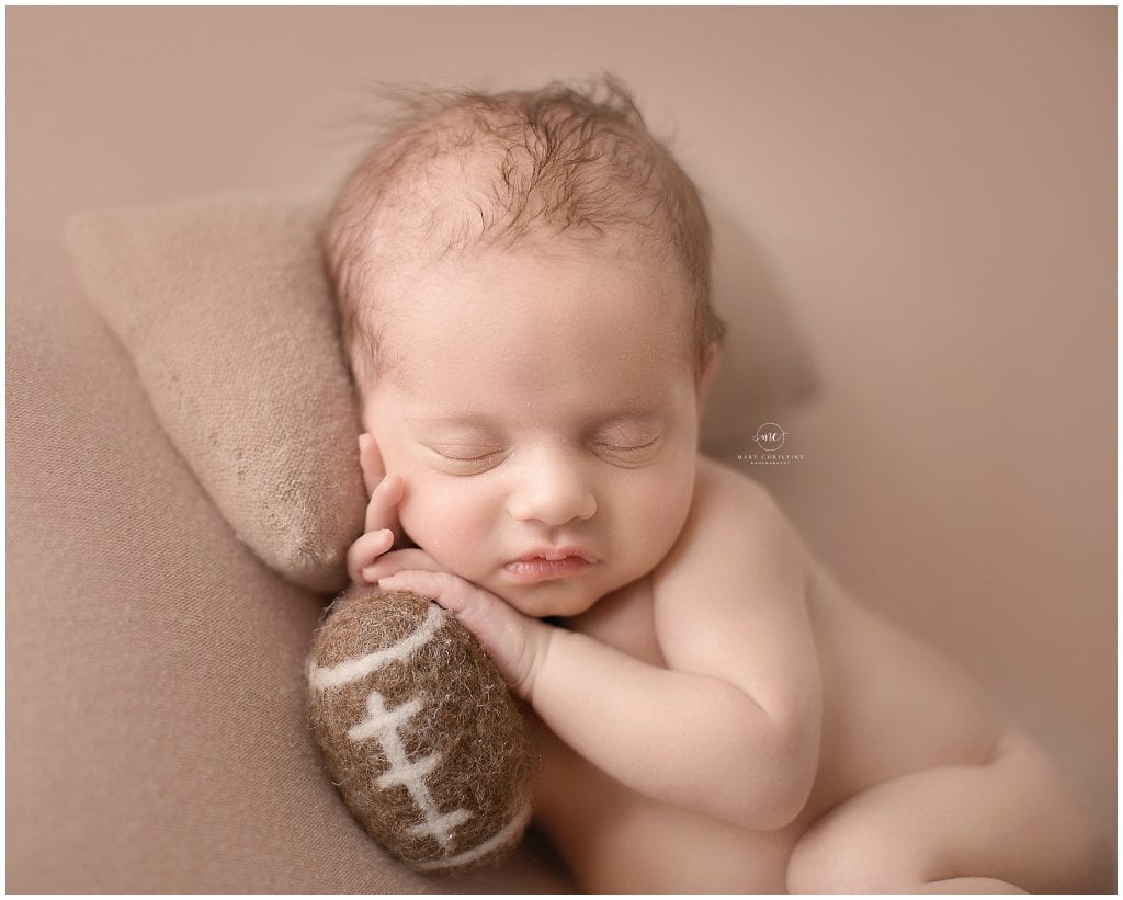 This little man’s nursery is sports themed. We had fun incorporating this little football and daddy’s baseball glove into his newborn baby session. Nothing says all American than football and baseball, right?