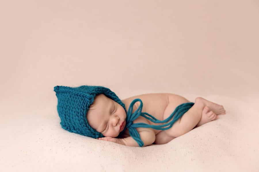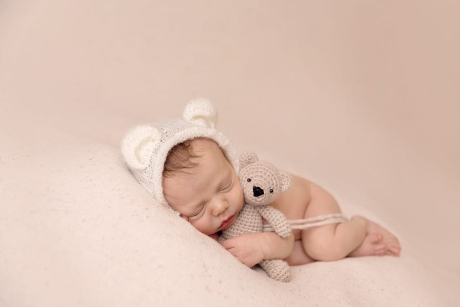 Ah, the sleepiest little bear! Love this lovey from Mary’s Knittin‘ and bonnet by Auspicious Laundry! The cream backdrop is by Roses and Ruffles.