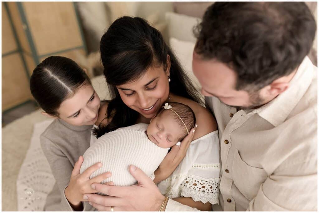 Newborn baby with family portrait, mother, father, and sibling, in a cozy home setting, natural light, capturing love and emotional bond, professional newborn photography, Mary Christine Photography.