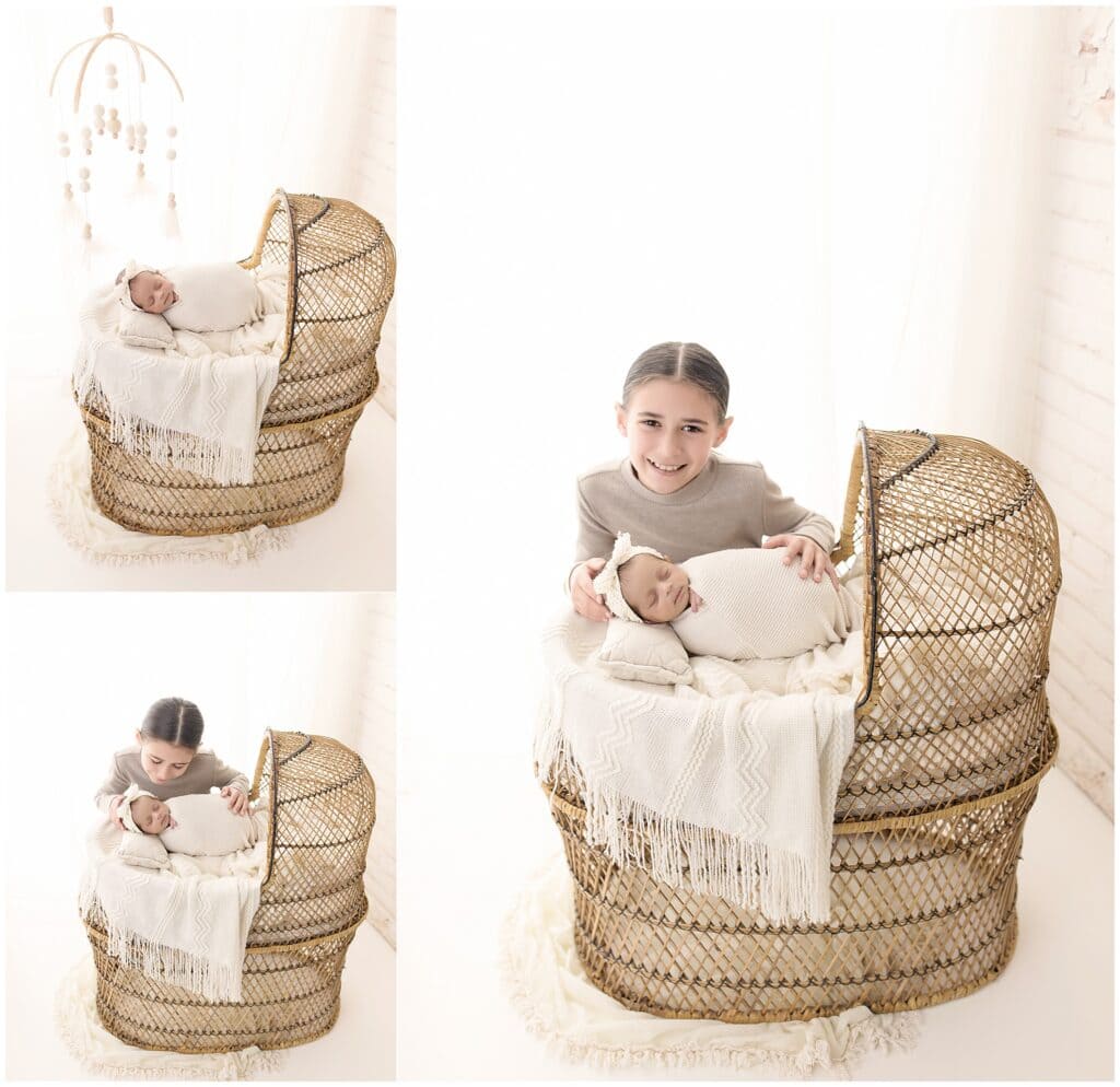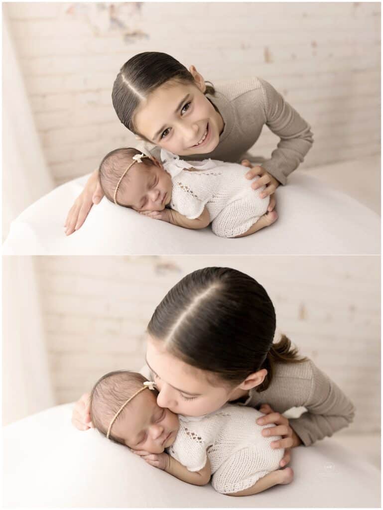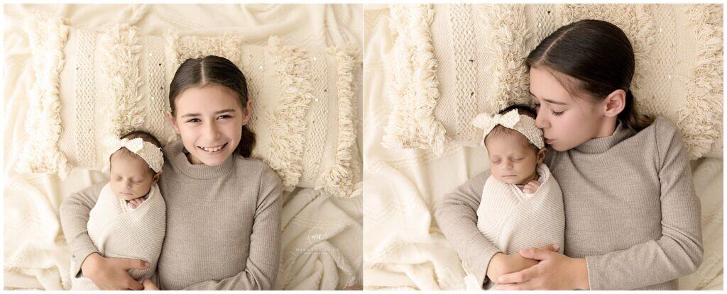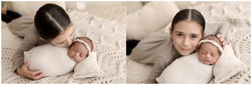 Soft newborn baby and older sister portrait in natural light at Mary Christine Photography, capturing precious moments with professional family and newborn photography services.