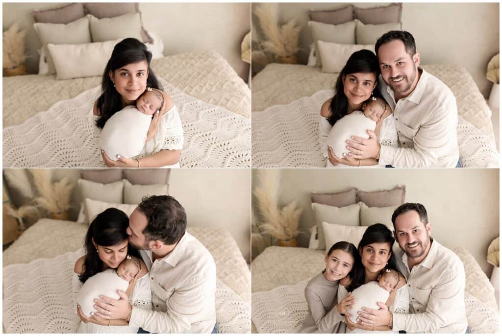 Newborn family portrait with mother, father, and sibling, capturing loving moments in a cozy, neutral-toned bedroom, professional photography by Mary Christine Photography.