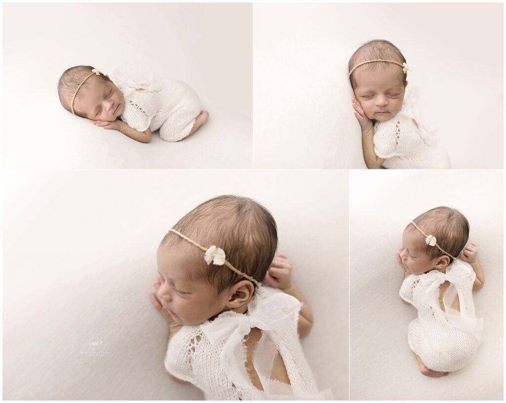 Baby sleeping newborn photo, newborn photography, Mary Christine Photography, adorable newborn baby girl in white knit outfit, peaceful sleep, natural light baby portrait, studio newborn session, professional baby photographer, Highland Park, Texas, baby girl photoshoot, cute baby with floral headband, peaceful newborn sleep, baby girl photography, soft and delicate baby images.