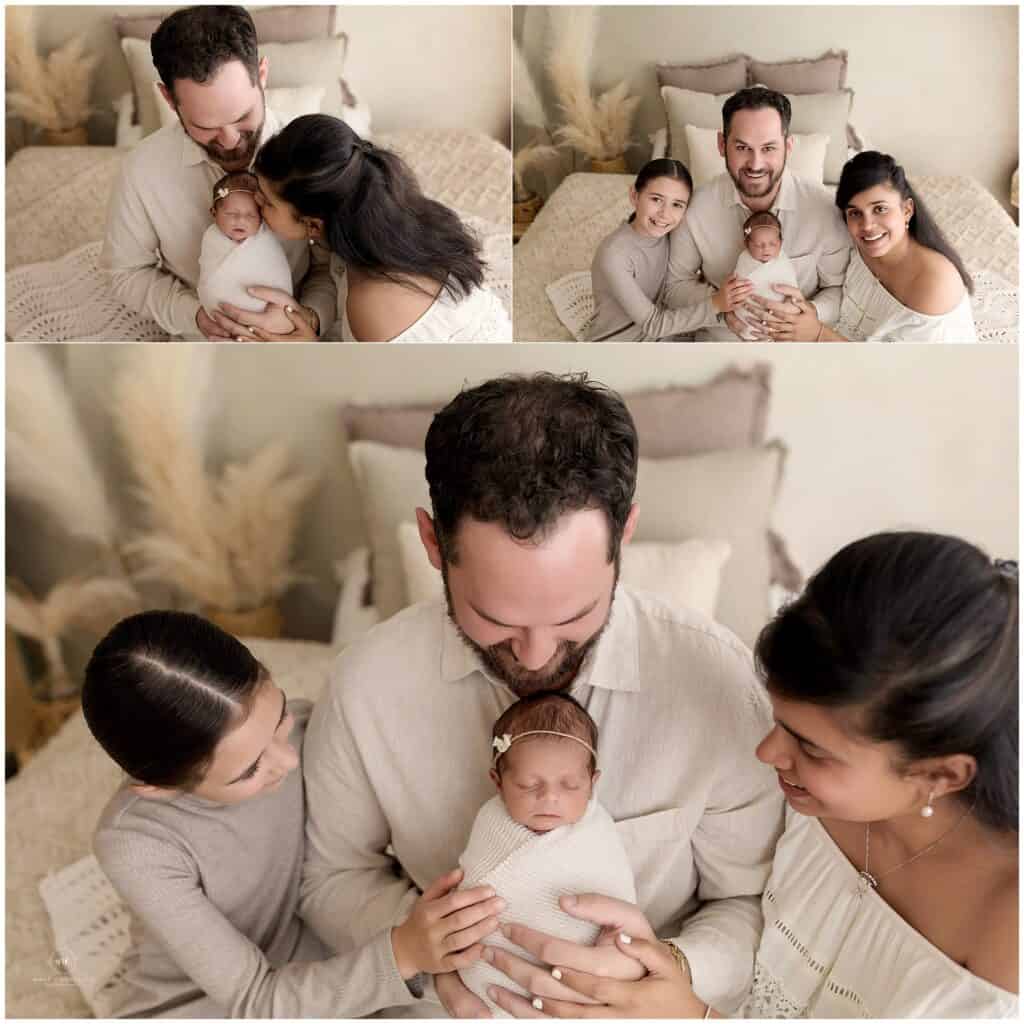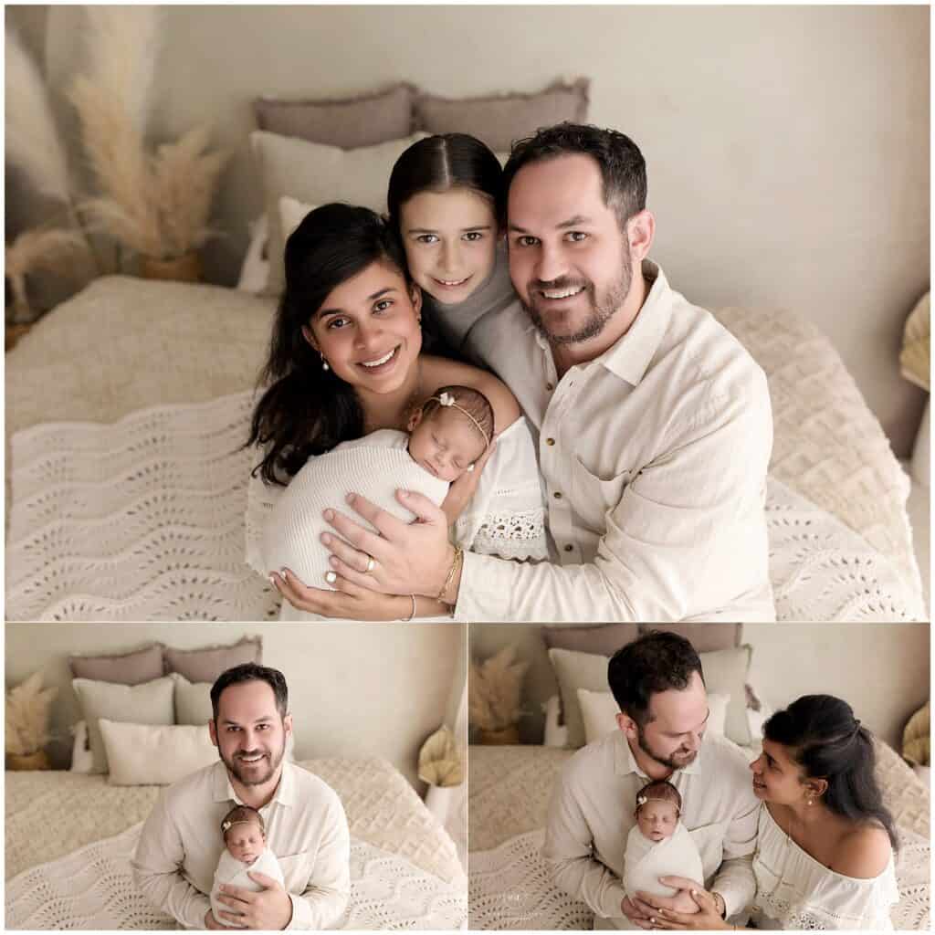 Soft family newborn photoshoot with parents and baby girl in cozy bedroom setting, natural light, elegant beige tones, capturing love and connection, Mary Christine Photography.