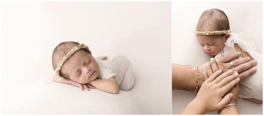 Sleeping newborn girl with delicate headband, captured in soft natural light, showcasing peaceful innocence for baby photography.