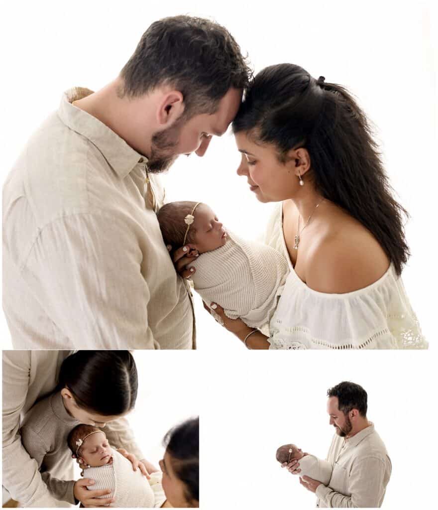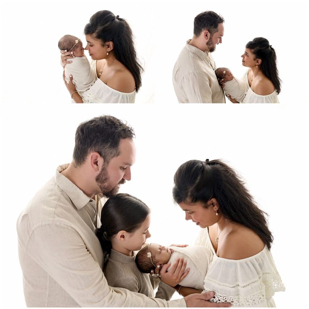 Delicate family newborn photography capturing tender moments of parents, children, and baby girl with white background, emphasizing love, connection, and new life.