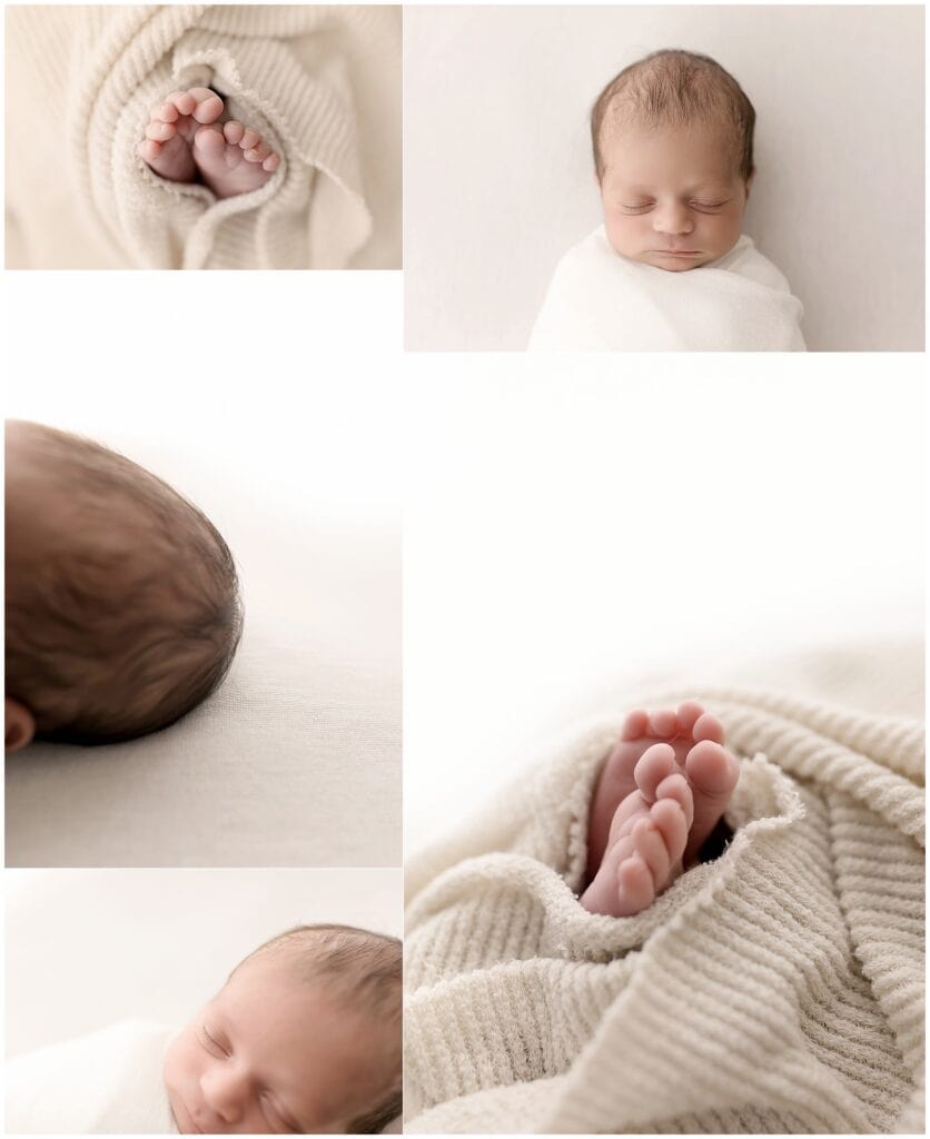 Newborn baby photography, cozy newborn portrait, soft neutral tones, professional baby photographer, maternity and newborn photography, Mary Christine Photography, baby feet and hair, delicate newborn imagery, adorable newborn cuddles.