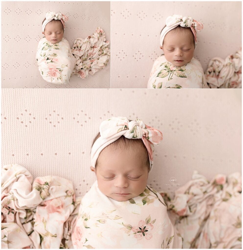 Soft newborn baby girl portraits with floral blanket and headband, Mary Christine Photography, pink pastel baby photography, delicate newborn photography studio, new baby session highlights relevance.