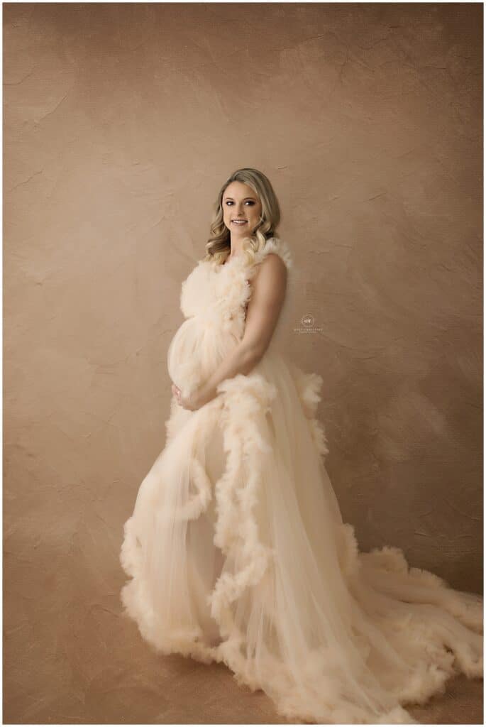 This dress is so much fun! Why not go a little extra for your maternity photoshoot? I love the texture and color of this one and is a client favorite from our studio wardrobe.