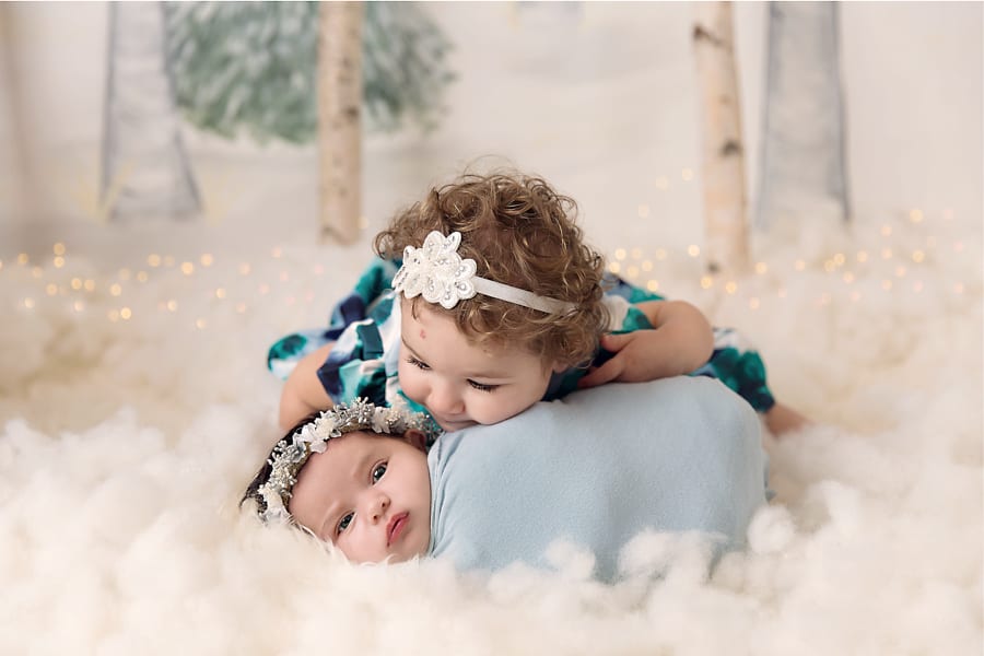 The way that her big sister is looking at her is nothing short of swoon worthy. I mean what could melt a momma’s heart more?? We did this set up for holiday cards. This year I’m loving the blue and grey tones for Christmas! The backdrop is hand painted by yours truly. You can see more of this drop and it’s creation on Instagram.