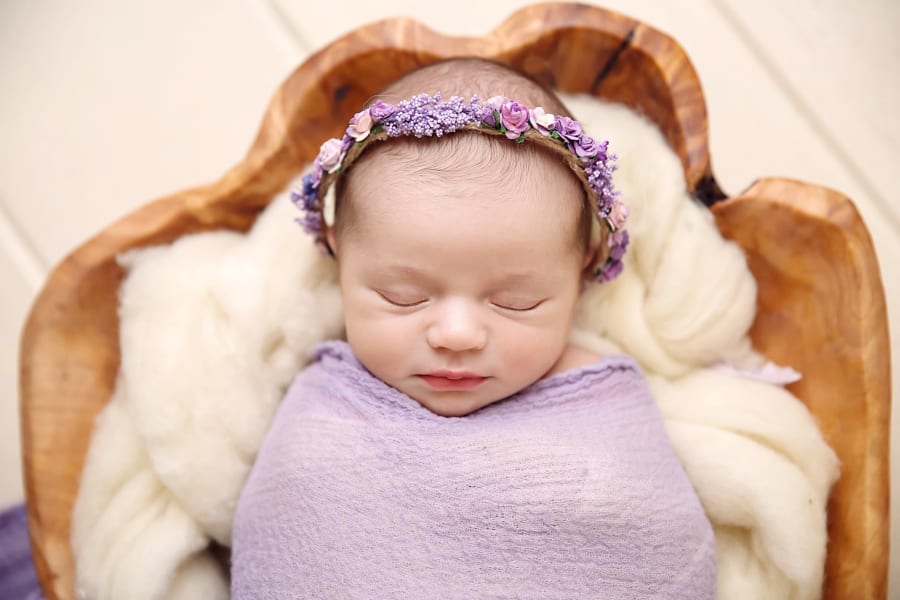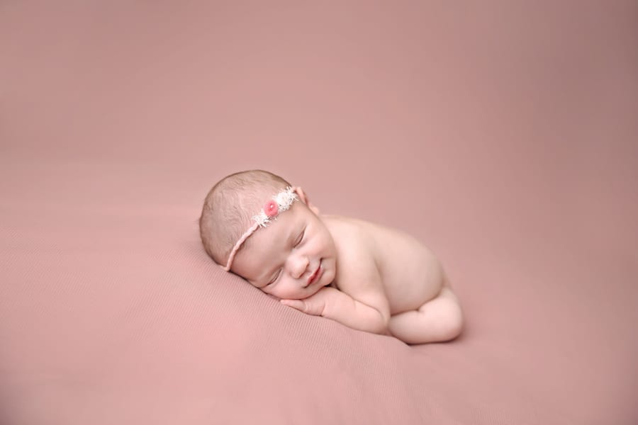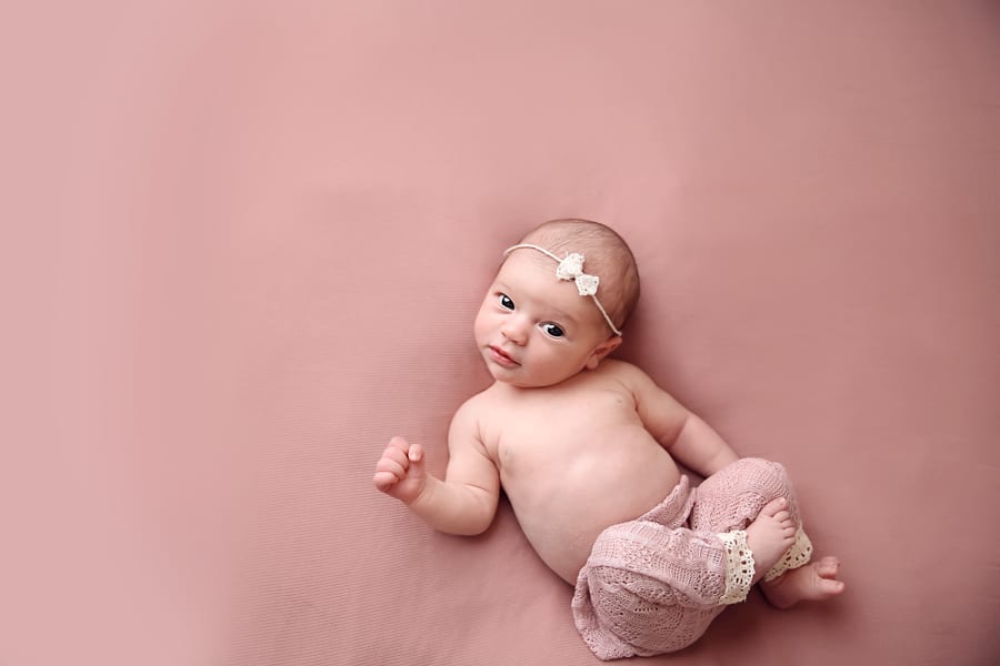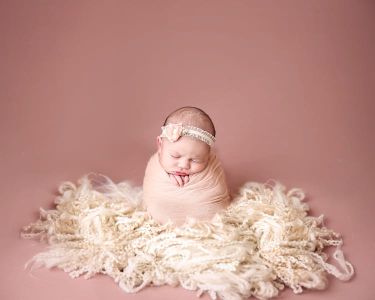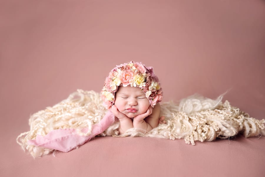 Look at that little smile. <3 I think we captured every little face she made, but my favorites are her smiles and the one great big yawn. Mom and Dad didn’t find out what they were having, so when she finally made her entrance, we went all girly. I love this soft rose color! Both backdrop and headband are by Devoted Knits.