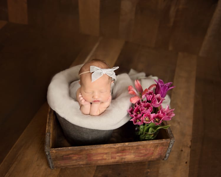 It’s spring time in Akron Ohio, so what’s better to use than the tulips that were popping up in our backyard? I’m slightly obsessed with babies in buckets (have you noticed??) but this set was a fun take on the usual. And that bow from Hello Miss Gorgeous was the perfect final touch.