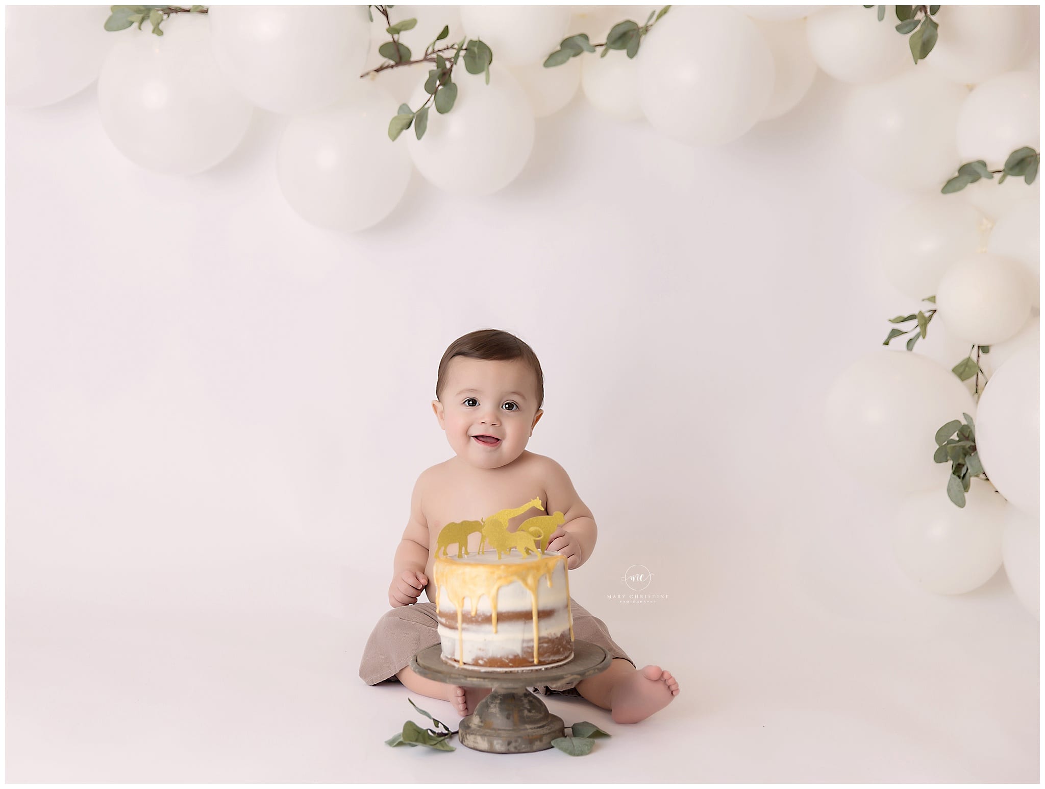 Brady’s first birthday theme is gold safari, I had a blast putting his cake smash set together! A balloon garland, greenery, and add a perfectly gold cake from A Cupcake A Day and boom!  We have a sweet but simple birthday set!  Just add one handsome baby. 😉