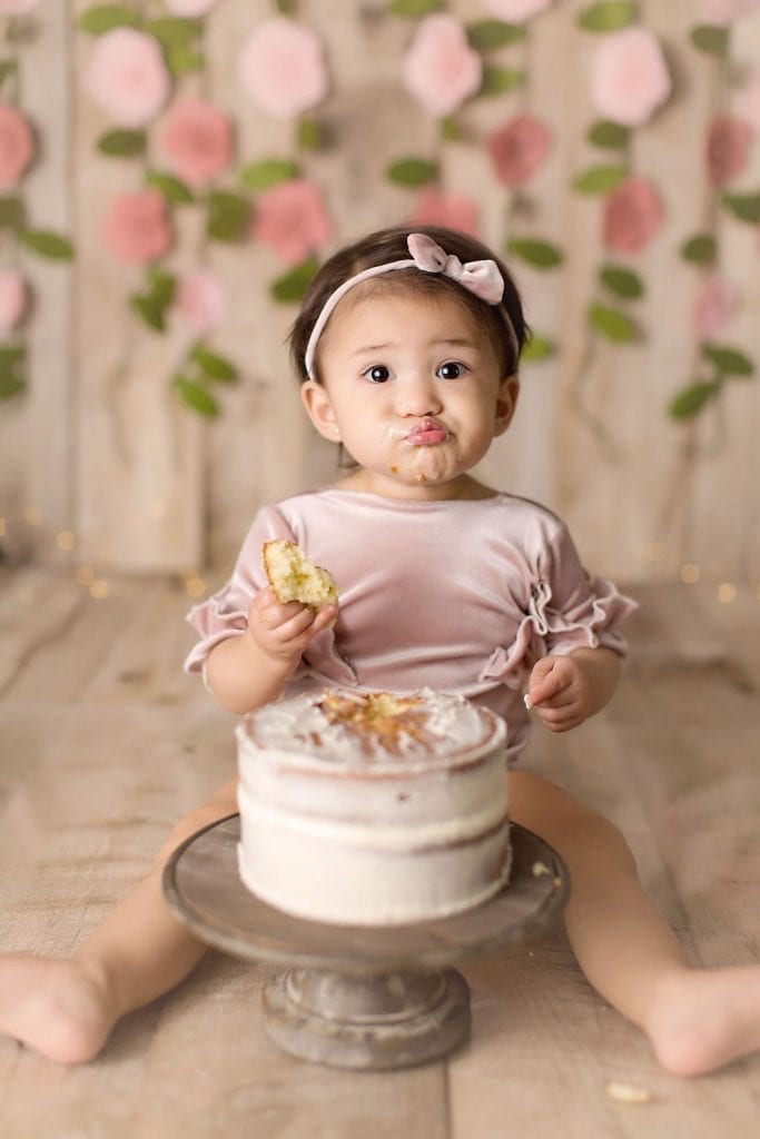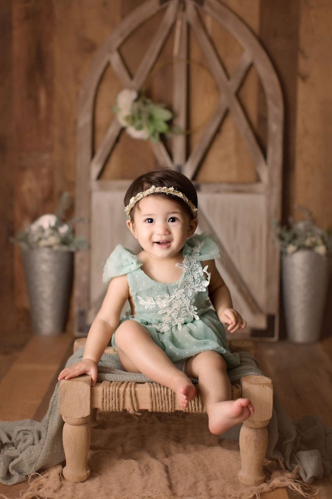 We always do a few classic sets before doing the cake smash at first birthday photography sessions. I love the greens in this set- how adorable is this outfit by Cora and Violet? There are so many cute outfits in the client wardrobe from there. I love the timeless and feminine designs!
