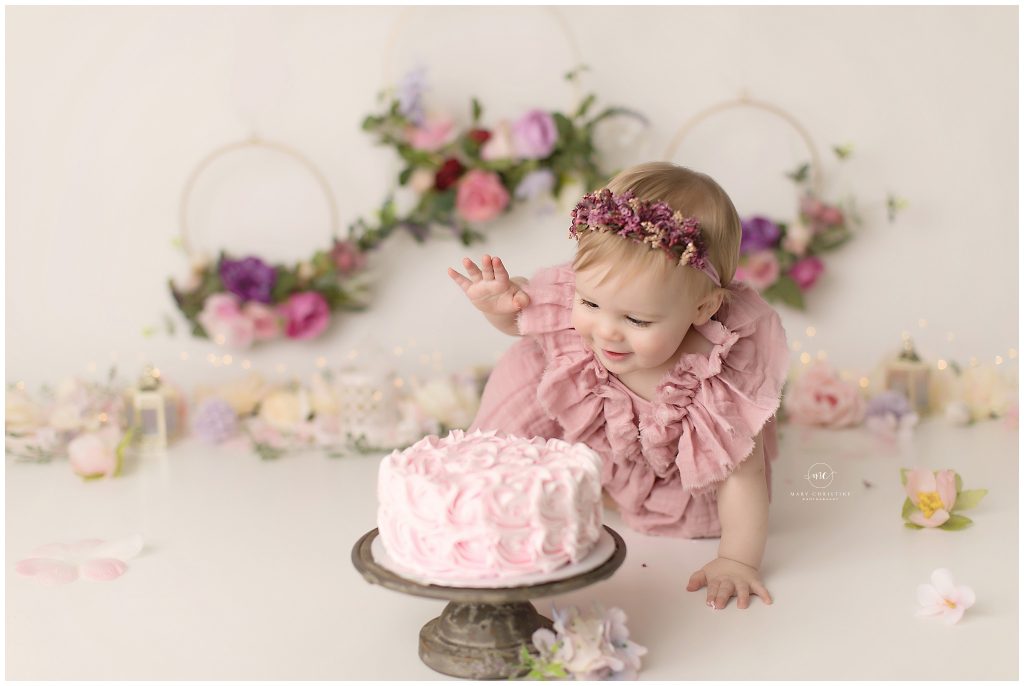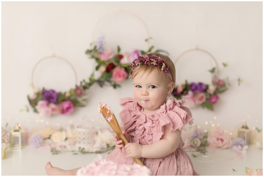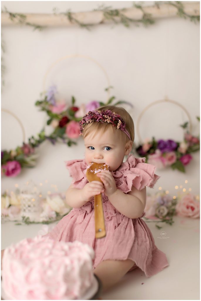 Momma requested floral hoops for baby girl’s first birthday photography session. Give me all the organic sets, y’all I live for sets like this! How adorable is her expression when she realizes that cake from Honey Bee Bakery is all for her? A girl after my own heart right there!