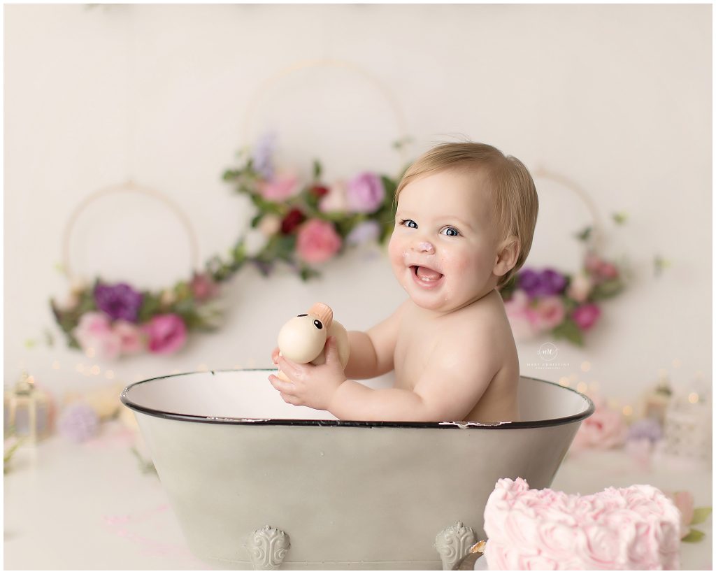 Every baby needs a claw foot bathtub to clean up in after eating some cake, don’t you agree? Baby girl was smitten with the rubber duck!