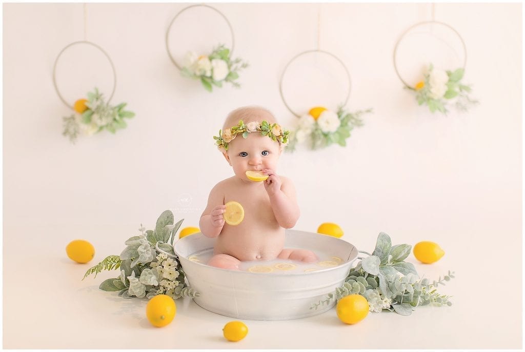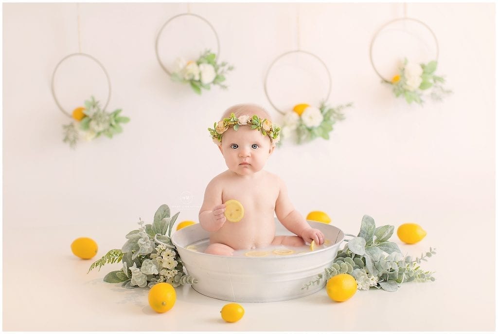 Here is what you need to consider for your kiddo’s fruit bath. Can they sit unsupported? Do they have any allergies? What colors do you want to use? If you love yellow like me, lemons are perfect. Seasonal fruit baths are also fun! Strawberries in June, apples in the fall, watermelon in the summer. You get the point! You can also opt for a flower milk bath as well!