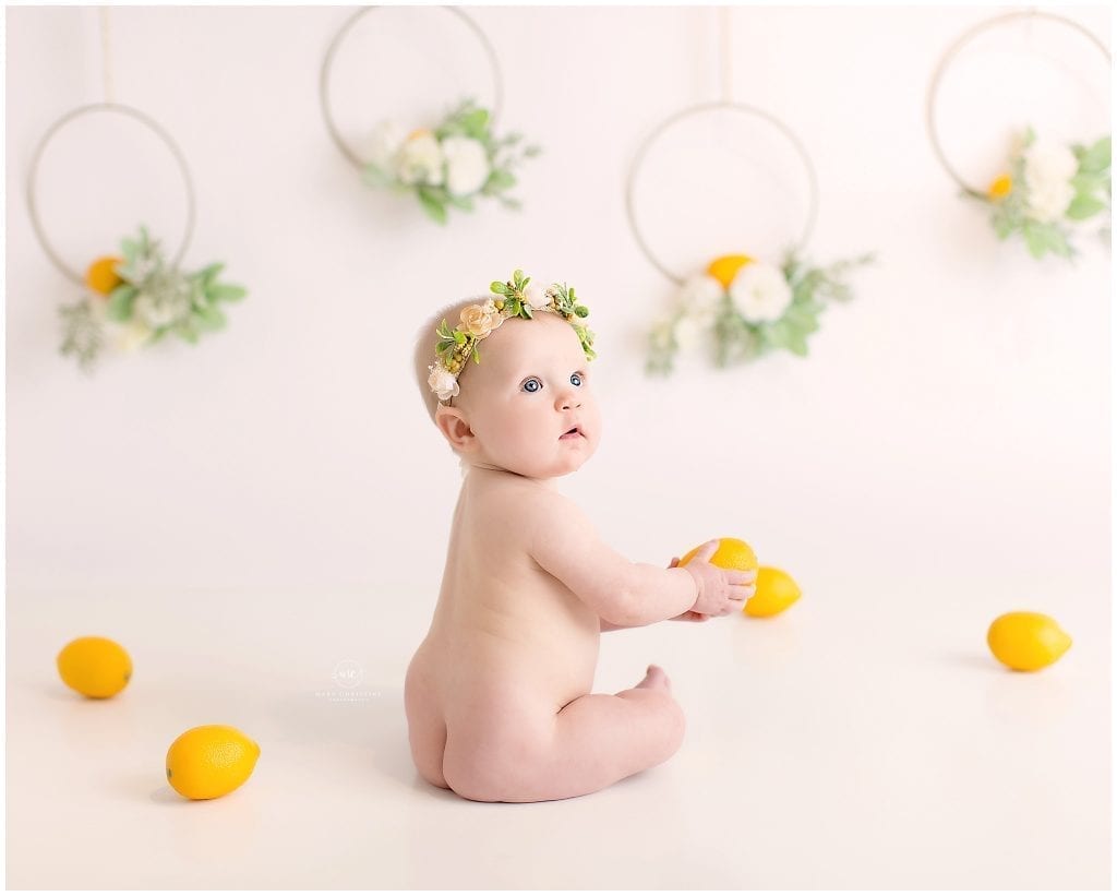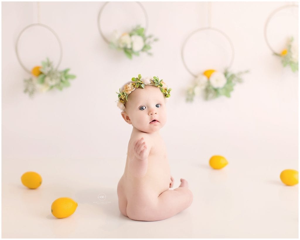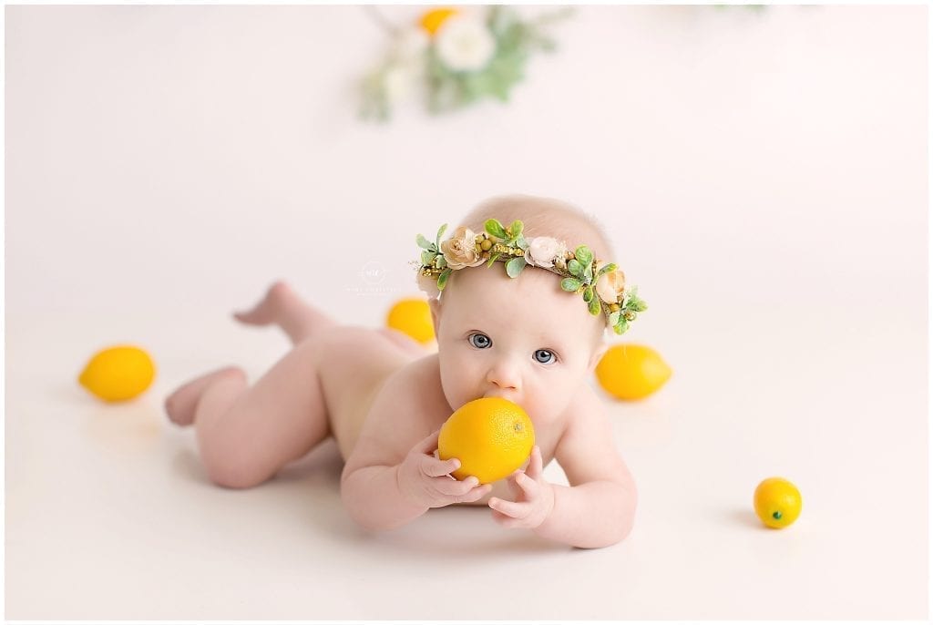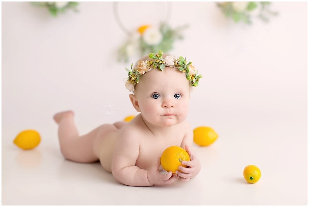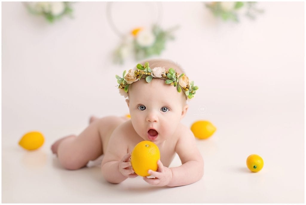 Lately I have had a few requests for fruit bath sessions and I have to admit, they are my new favorite! Fruit baths are a fun change up for your baby’s milestone session. Not only are they adorable, but they keep your little one entertained. I mean what baby doesn’t love a good splash in the tub with a little food playtime??