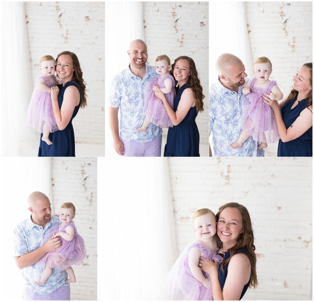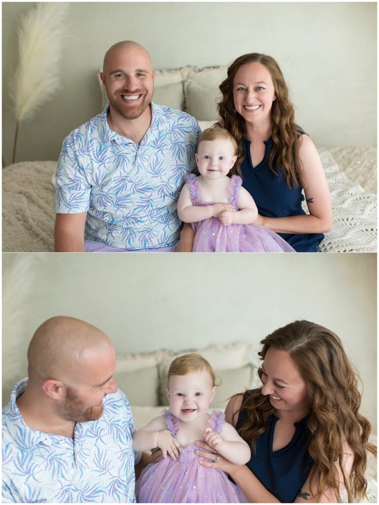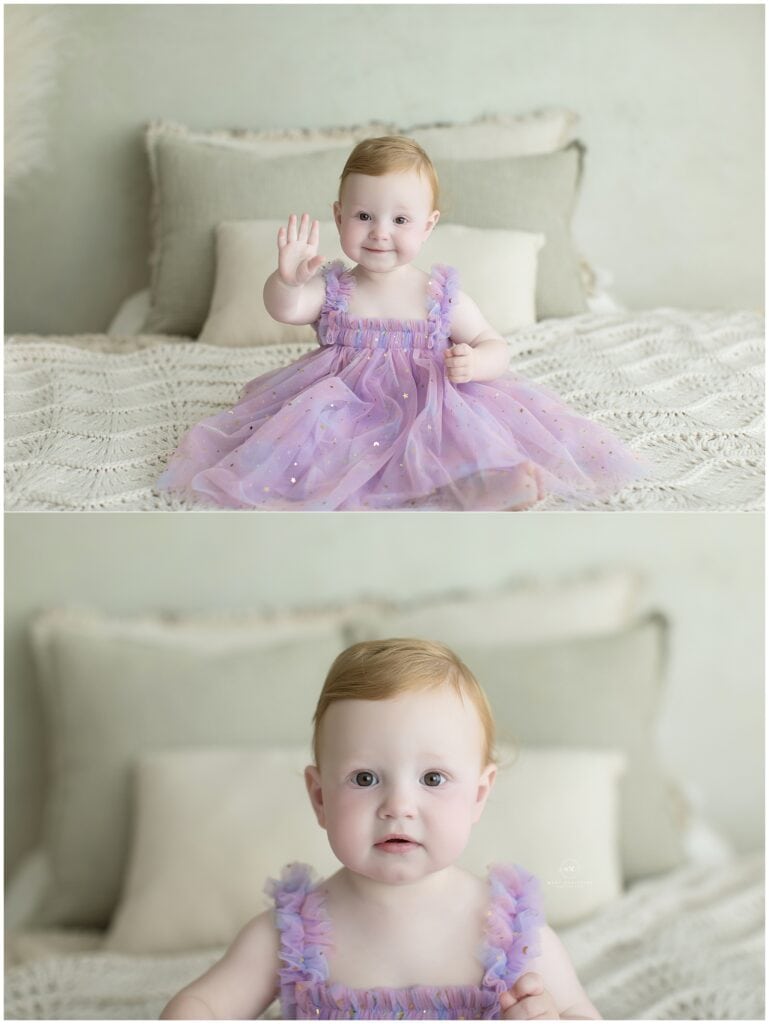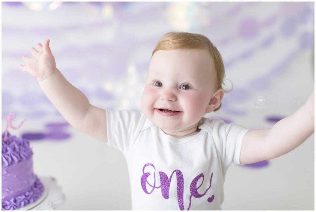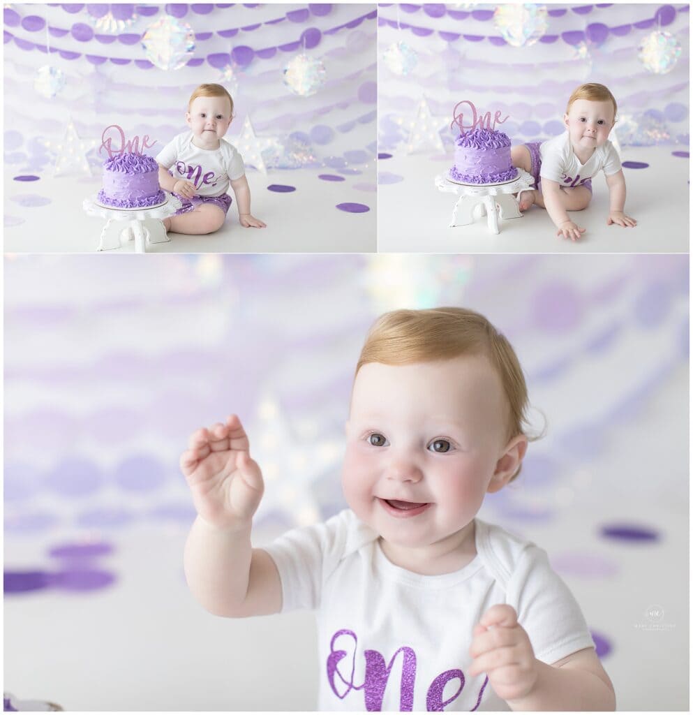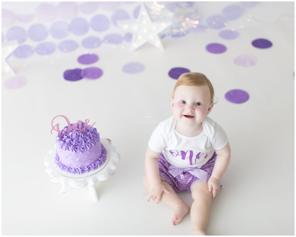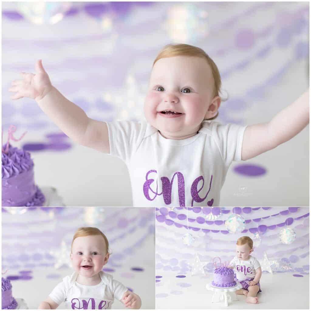 Welcome this sweet baby girl’s lavender haze cake smash to the Cleveland baby photographer blog today! Oh my heavens, it feels like just yesterday this adorable family was in studio for her newborn session. One of the best parts of being a baby photographer is seeing the changes one year can bring- it is such an exciting time of growth, development, and overwhelming love for a family.