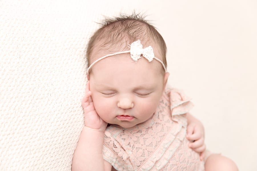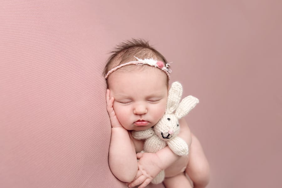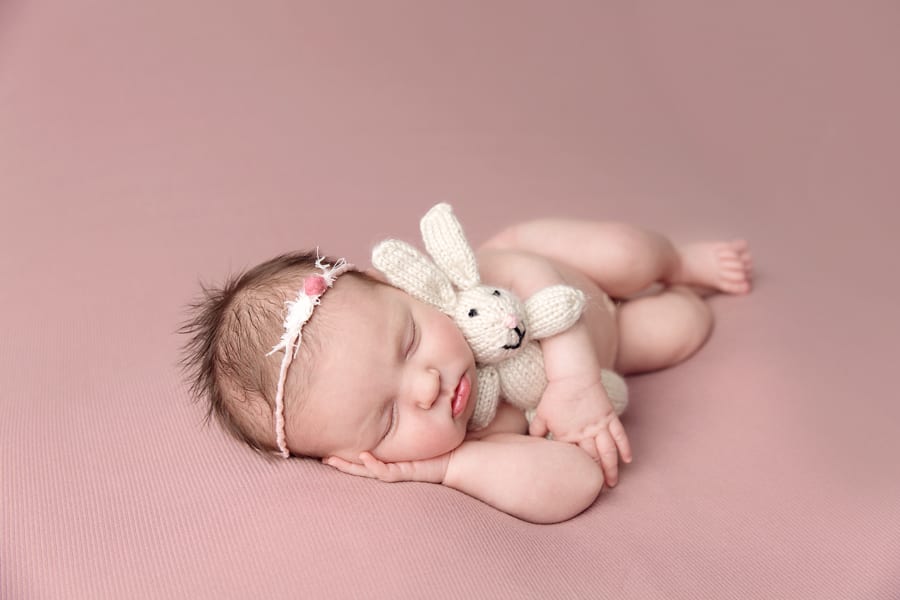Miss Madelyn was 14 days new for her session and at 8 pounds, one of the bigger little girls I have had lately. But she was oh so good and oh so sweet! I love this soft pink drop and tieback by Devoted Knits and of course, this famous bunny by Marys Knittin‘!