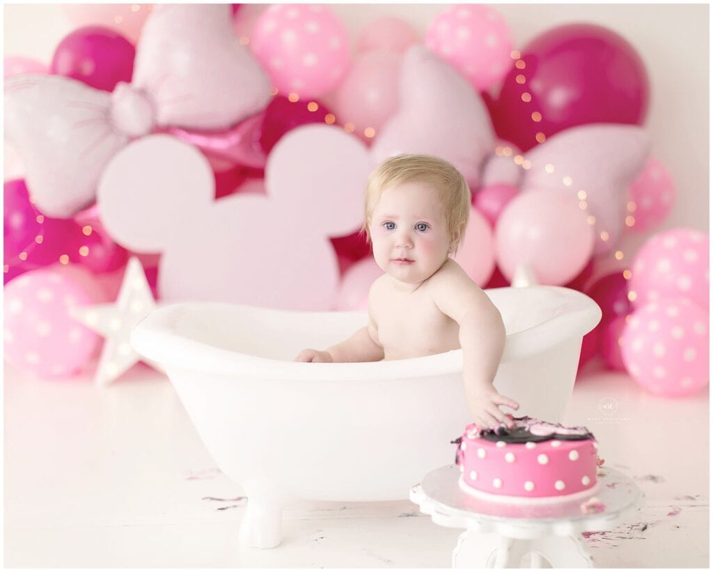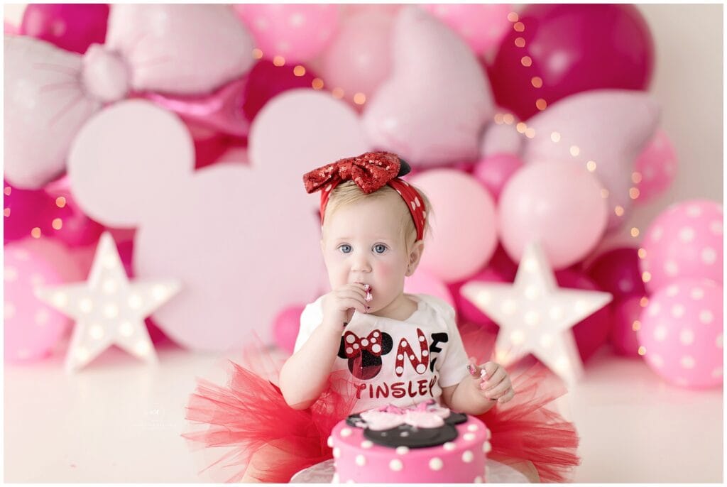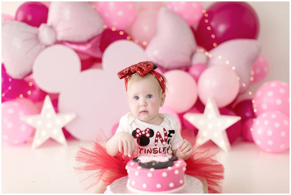 Bright baby girl celebrating first birthday with pink balloons, Minnie Mouse cake, and festive decorations in a studio photo shoot.