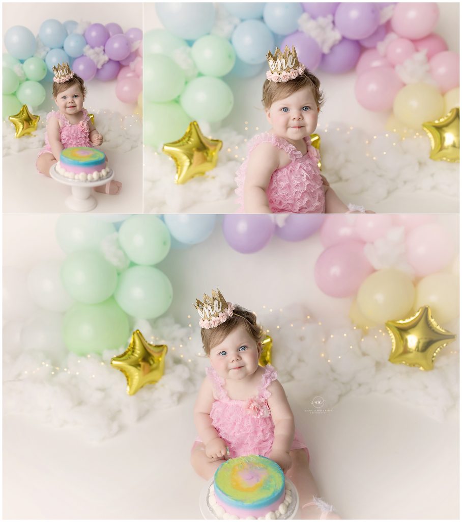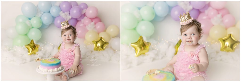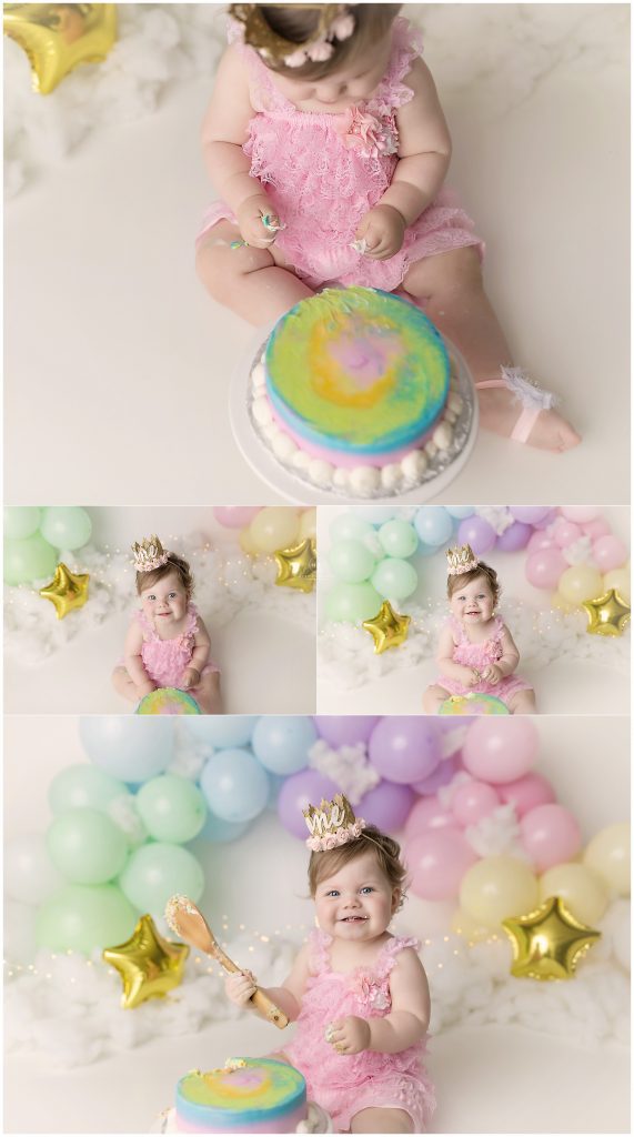Momma requested a pastel rainbow cake smash for her first birthday. Oh how fun is this theme? Pastel colors make my heart so happy! As do whimsical sets like this.