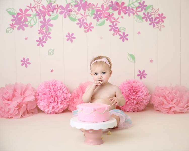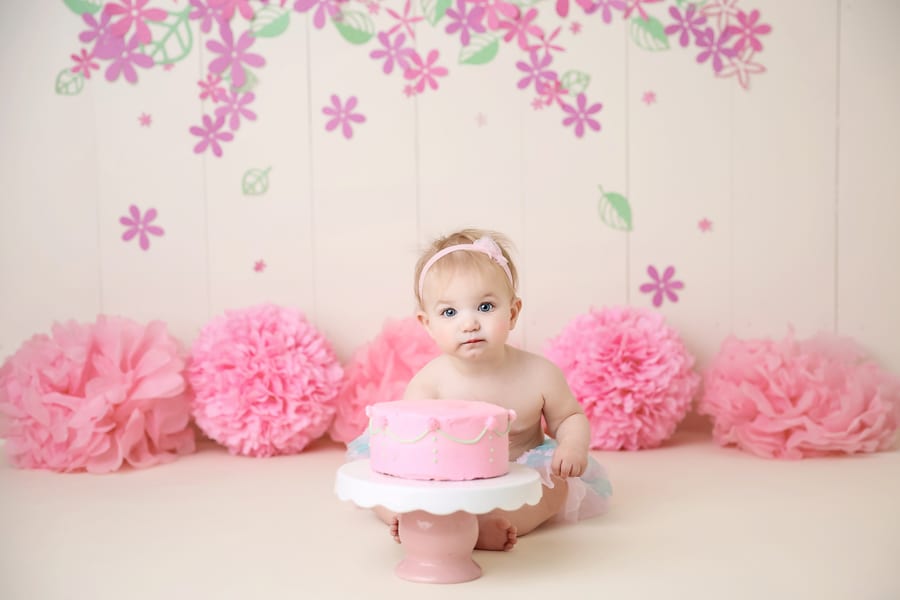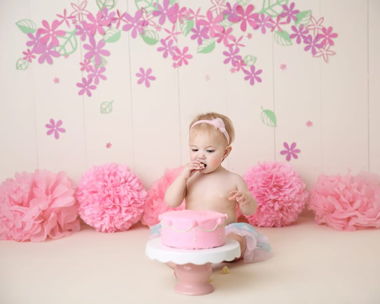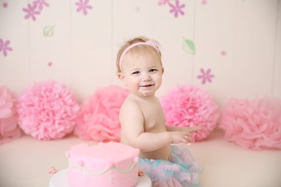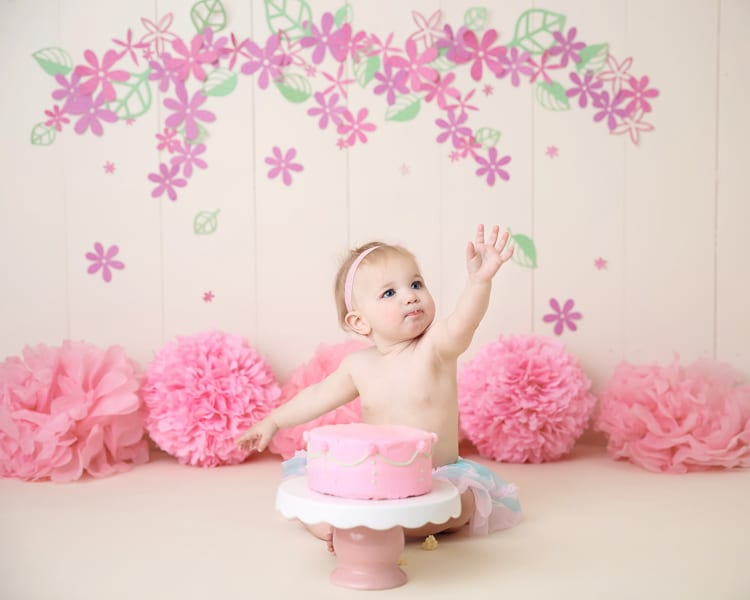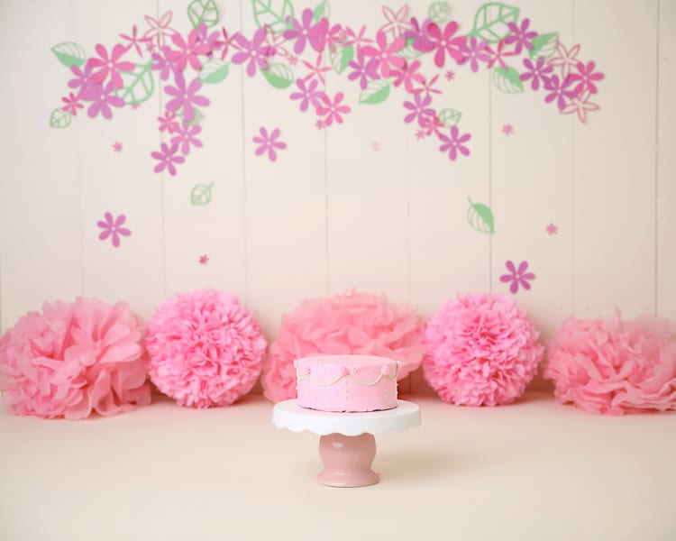 This adorable cake is from A Cupcake A Day in Medina Ohio! We love all of Shawna’s creations! The flowers were handmade by yours truly- did you know that every cake smash session is completely custom?? 🙂