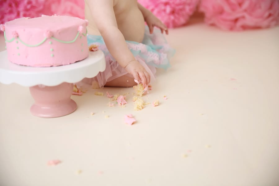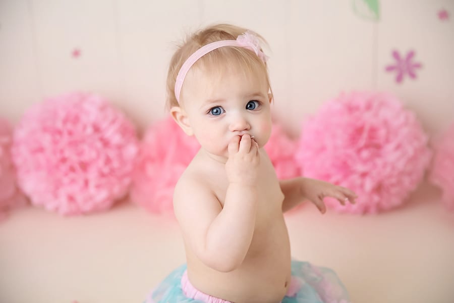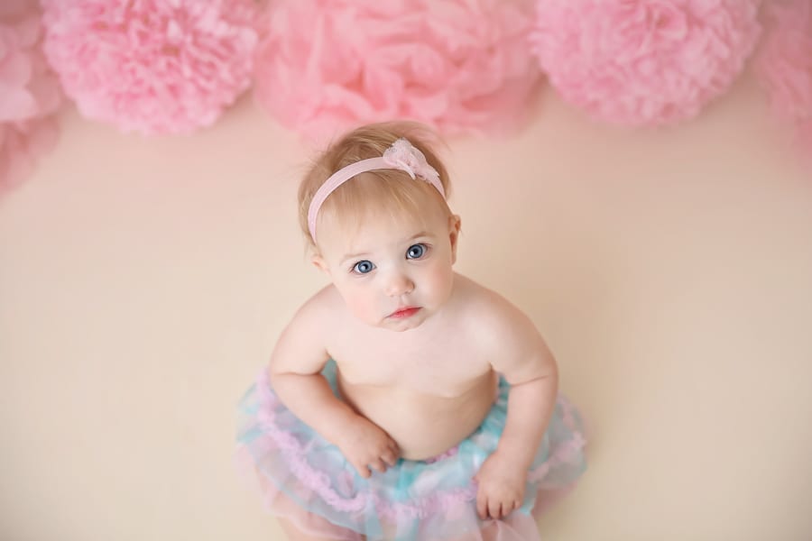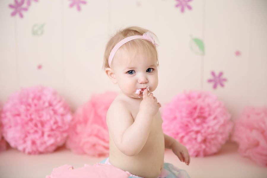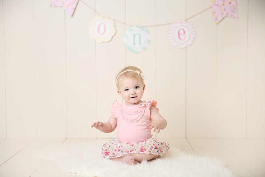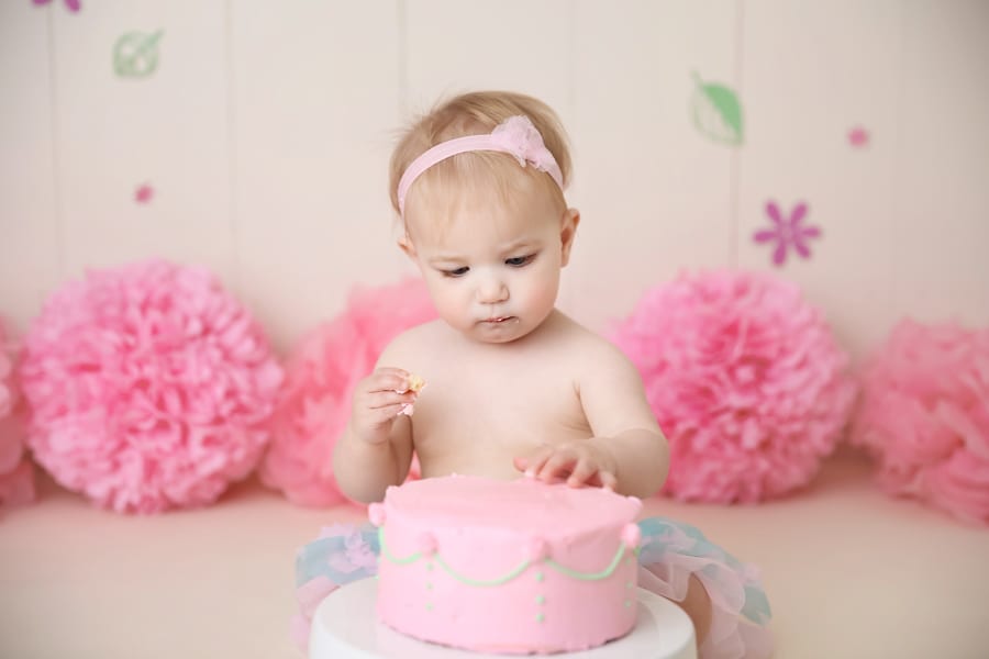This adorable cake is from A Cupcake A Day in Medina Ohio! We love all of Shawna’s creations! The flowers were handmade by yours truly- did you know that every cake smash session is completely custom?? 🙂