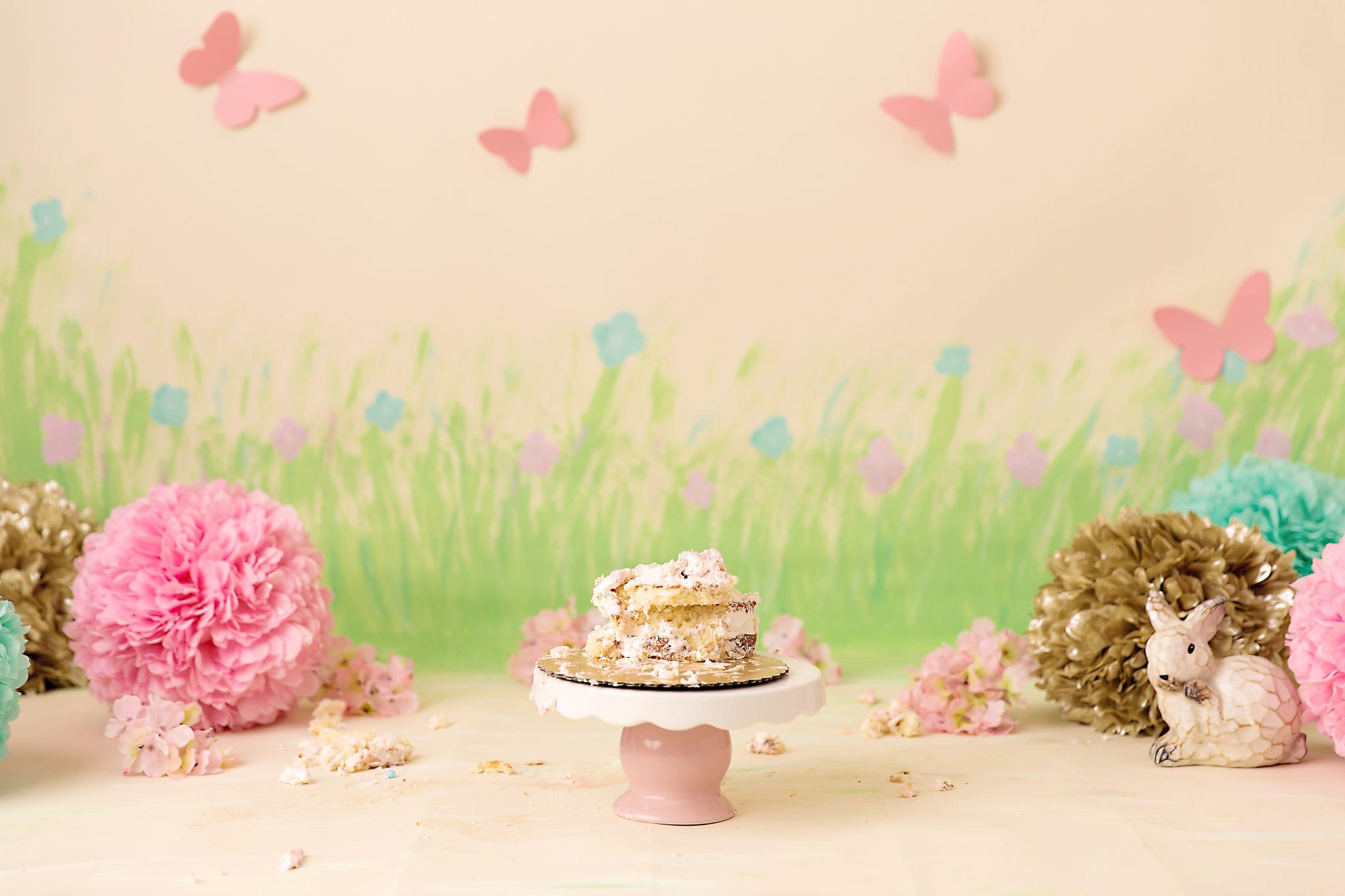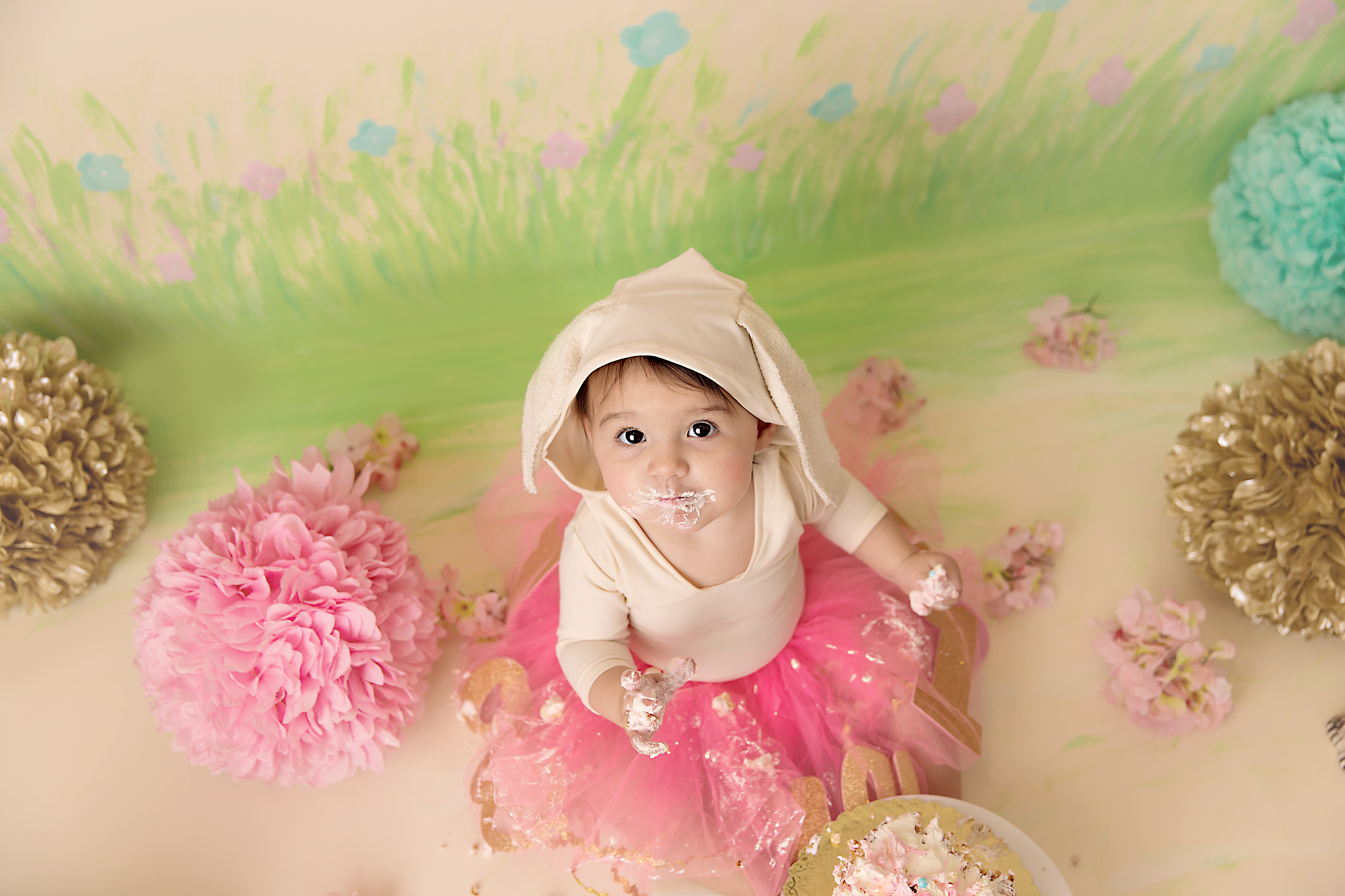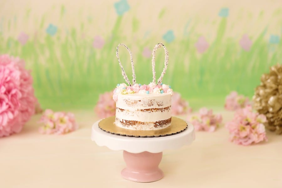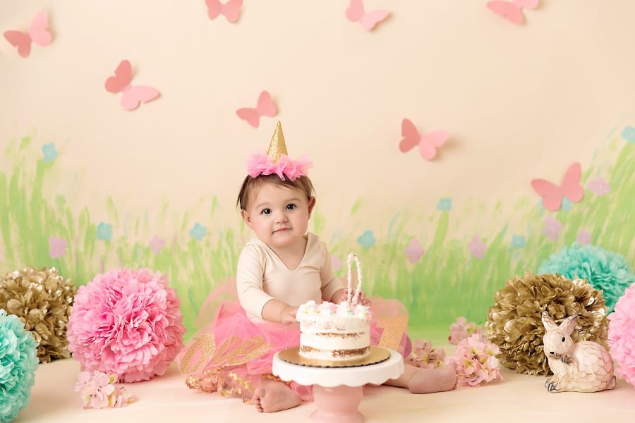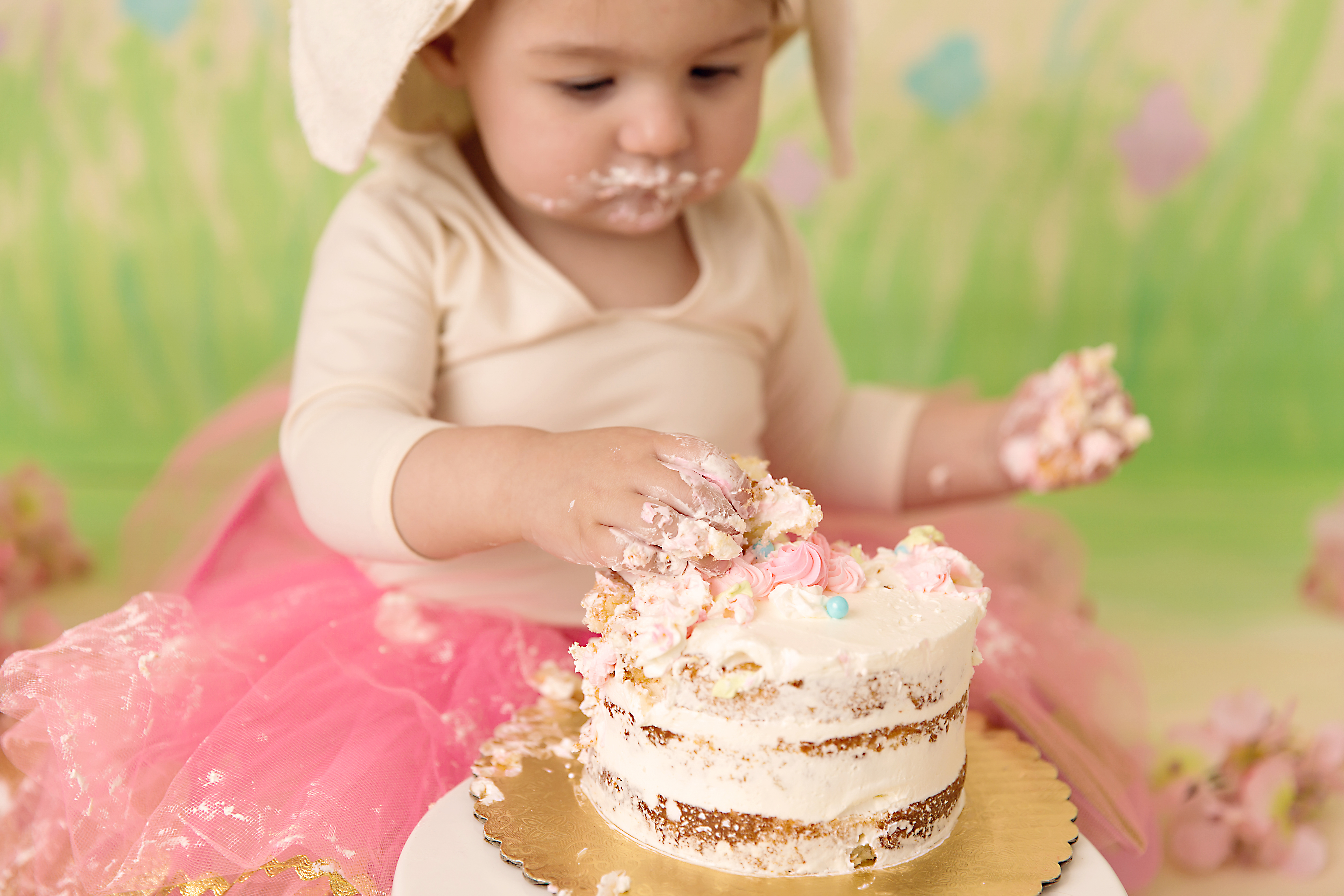 Even though it was June, northeast Ohio weather threw our outdoor cake smash session for a curve ball, it was so cold we had to move the session inside.  Not to worry though, I whipped up set in a hurry!  You can see the time lapse video of me painting here.  Creating sets is always part of the fun!