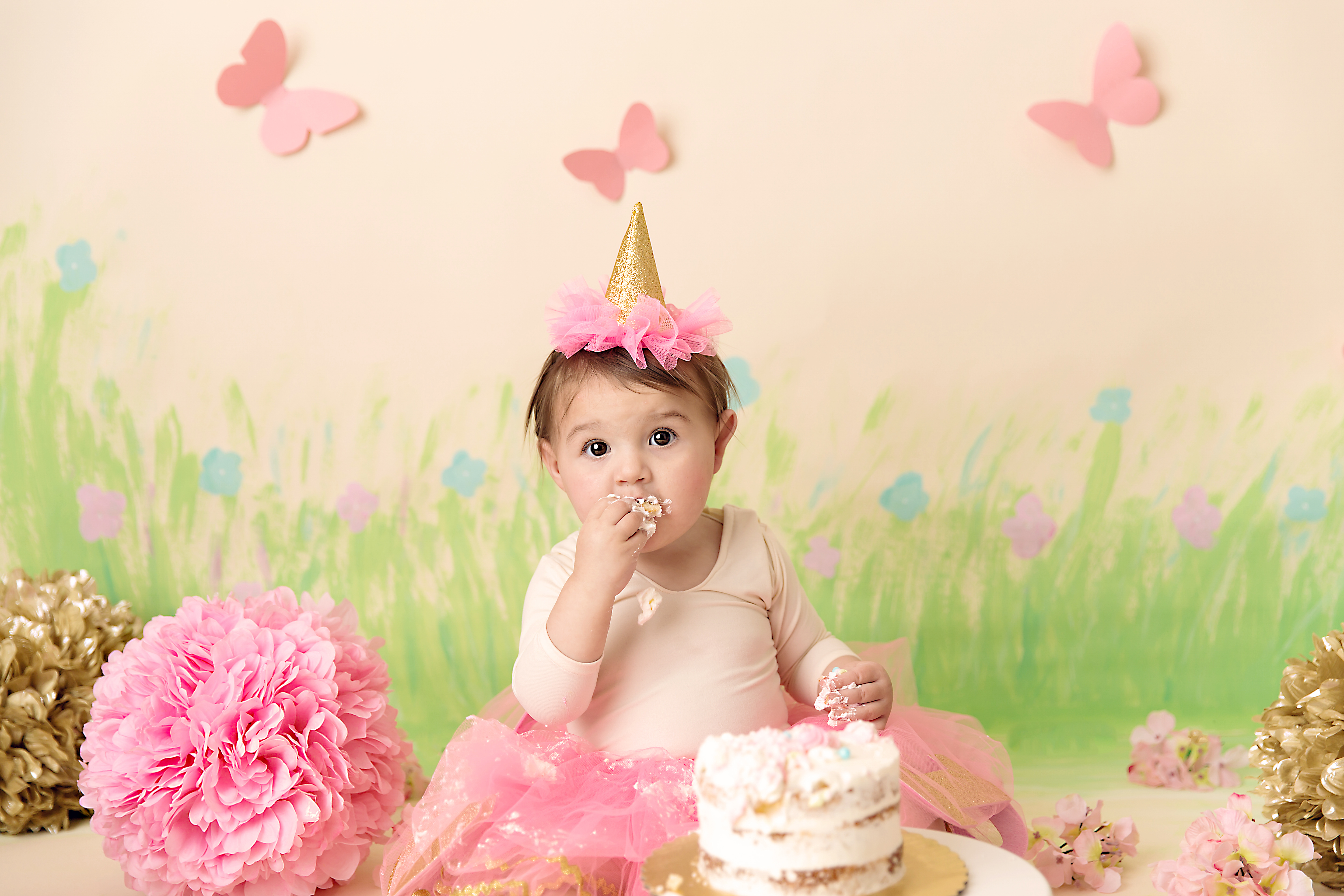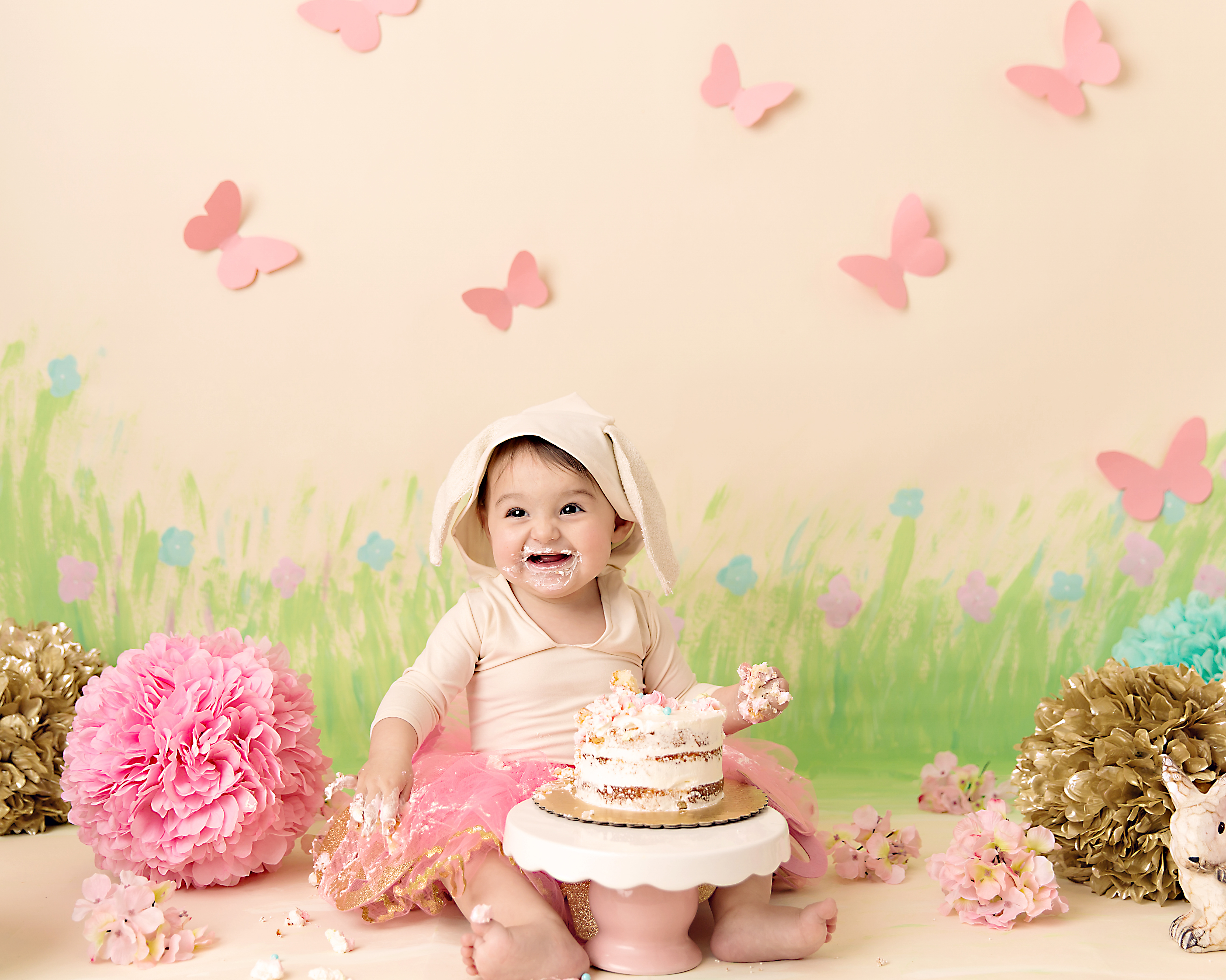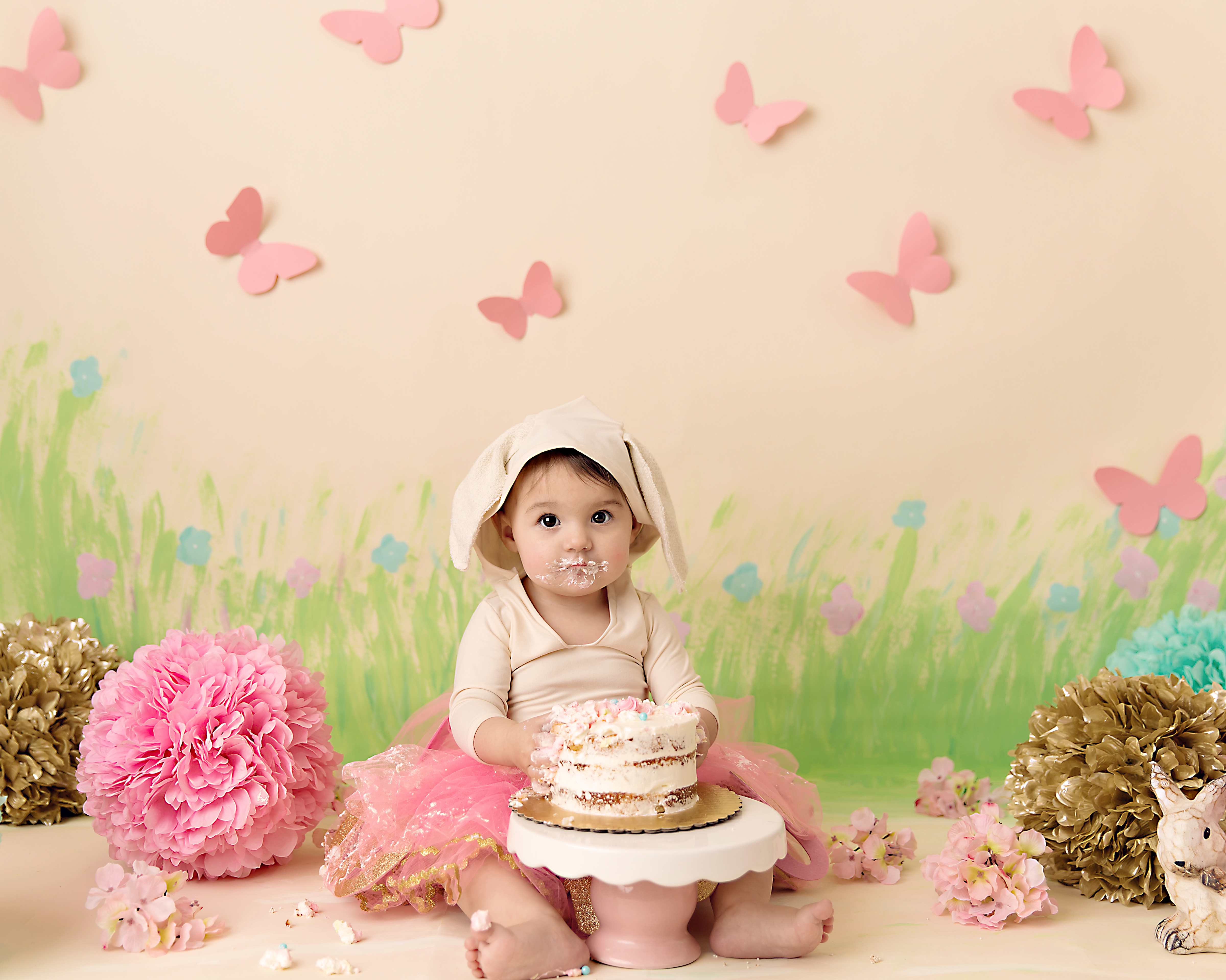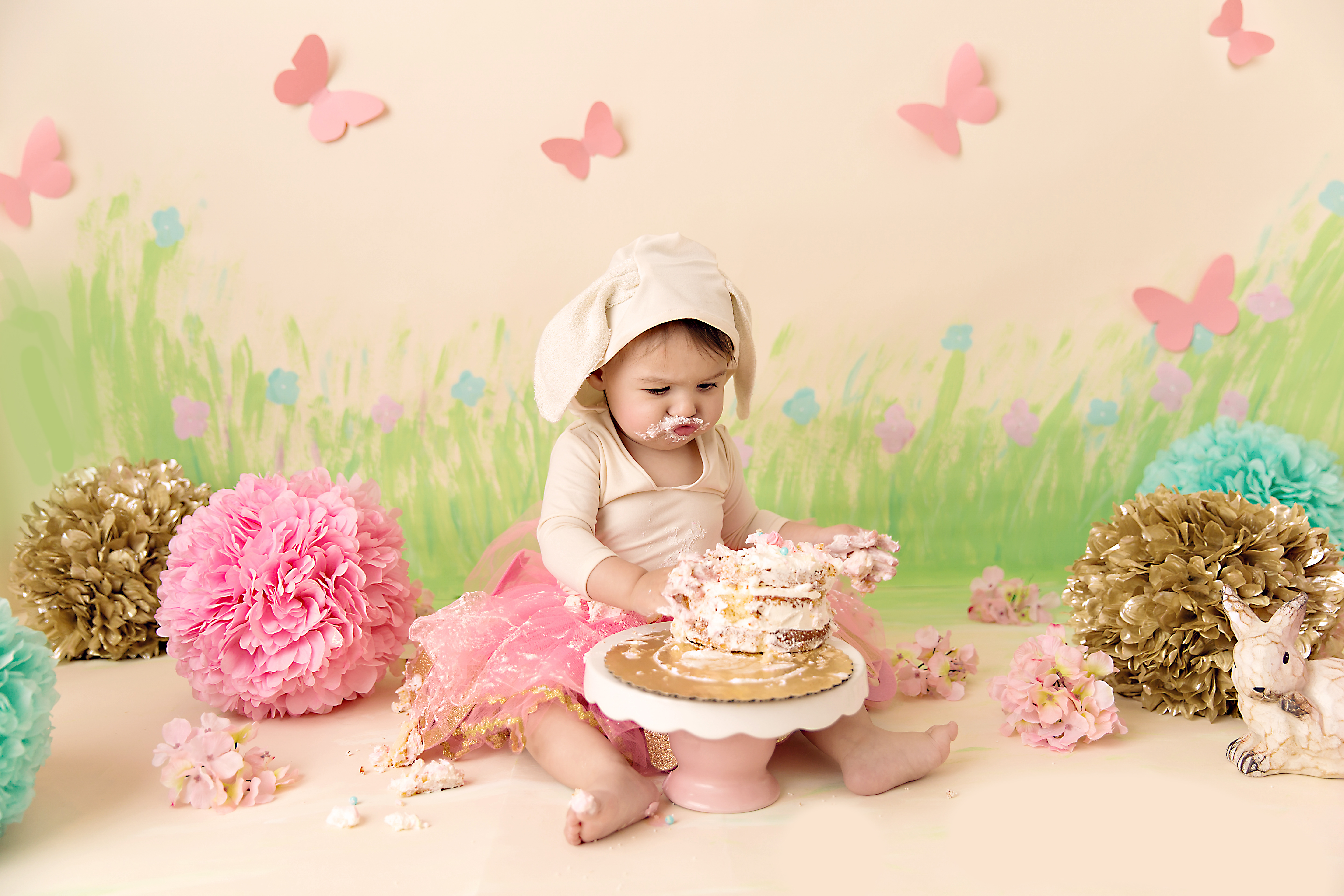 Even though it was June, northeast Ohio weather threw our outdoor cake smash session for a curve ball, it was so cold we had to move the session inside.  Not to worry though, I whipped up set in a hurry!  You can see the time lapse video of me painting here.  Creating sets is always part of the fun!