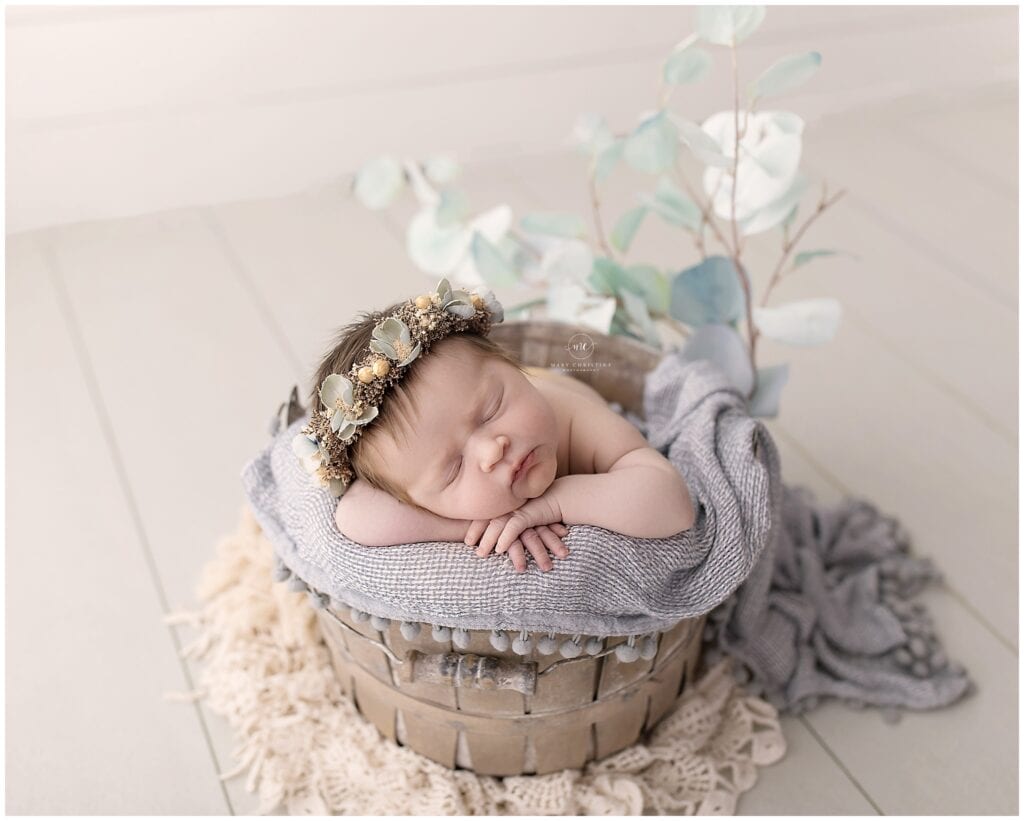 The bucket pose can be really tricky for my students. If you are a photographer that is struggling with this pose, here is a tip for you. Take the baby from the chin on hands pose on the bean bag to the bucket and keep them in the same position. Works like a charm!
