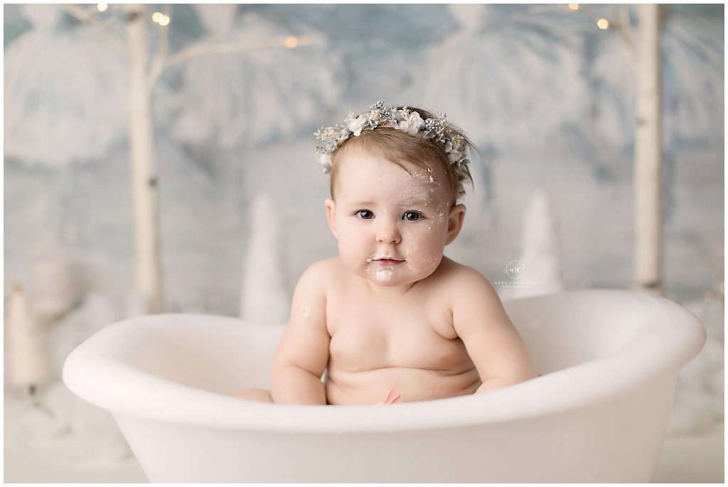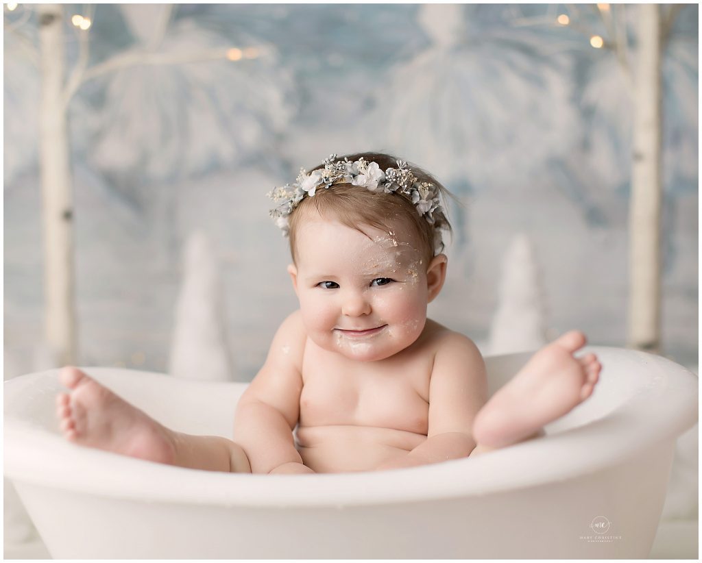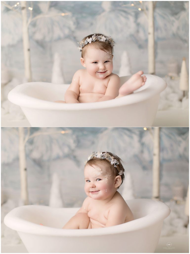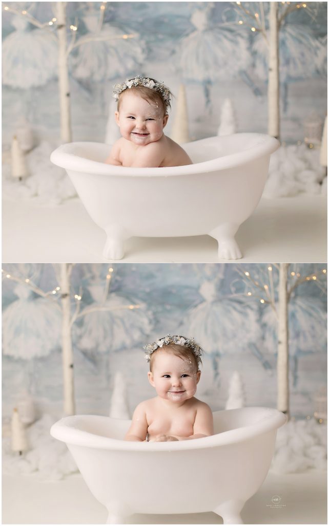 It turns out that all baby girl wanted from her winter onederland cake smash is a bath. She really turned on her adorable personality once she got into the tub! Those little feet popping out over the edge with her baby rolls, it’s all too much!
